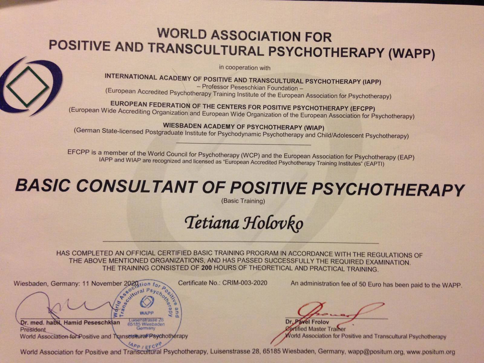 Сертификат Позитивная транскуртуральная психодинамическая психотерапия (Н. Пезешкиян)2018 год,
