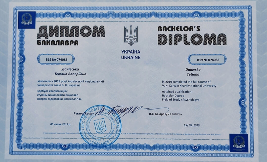 -Харьковский Национальный Университет им.Каразина 2015-2019 год, специализация 'Практическая психология"