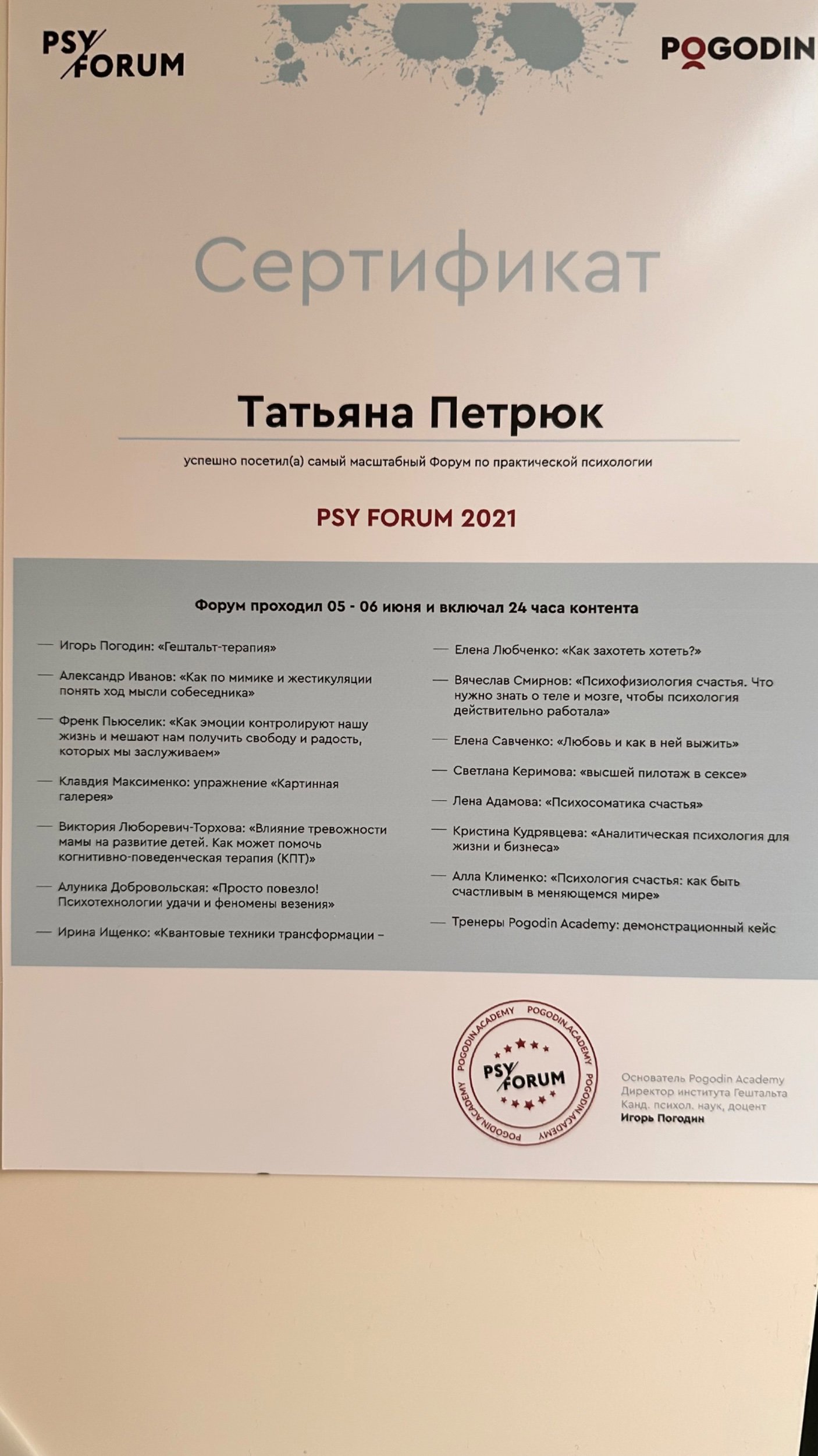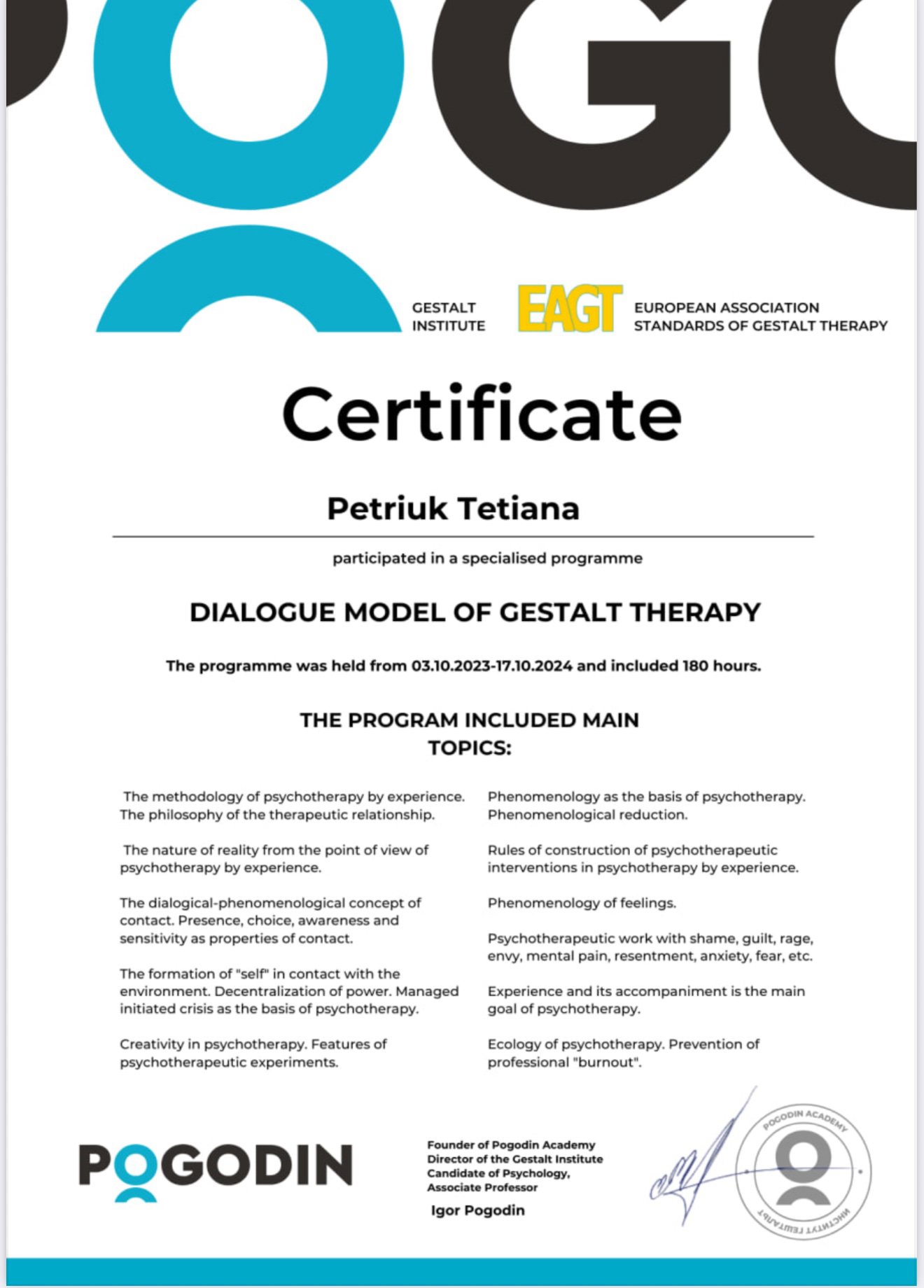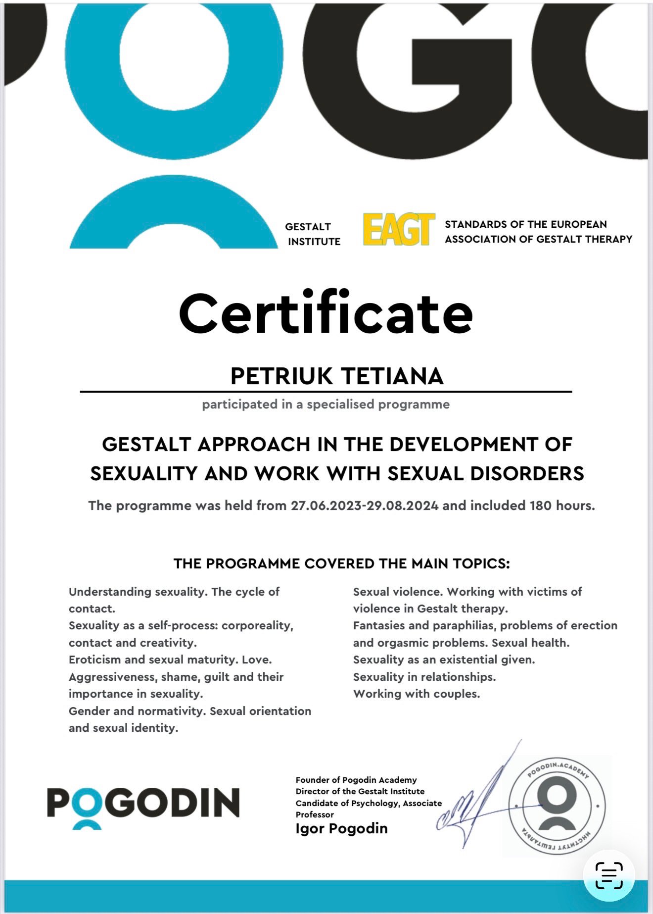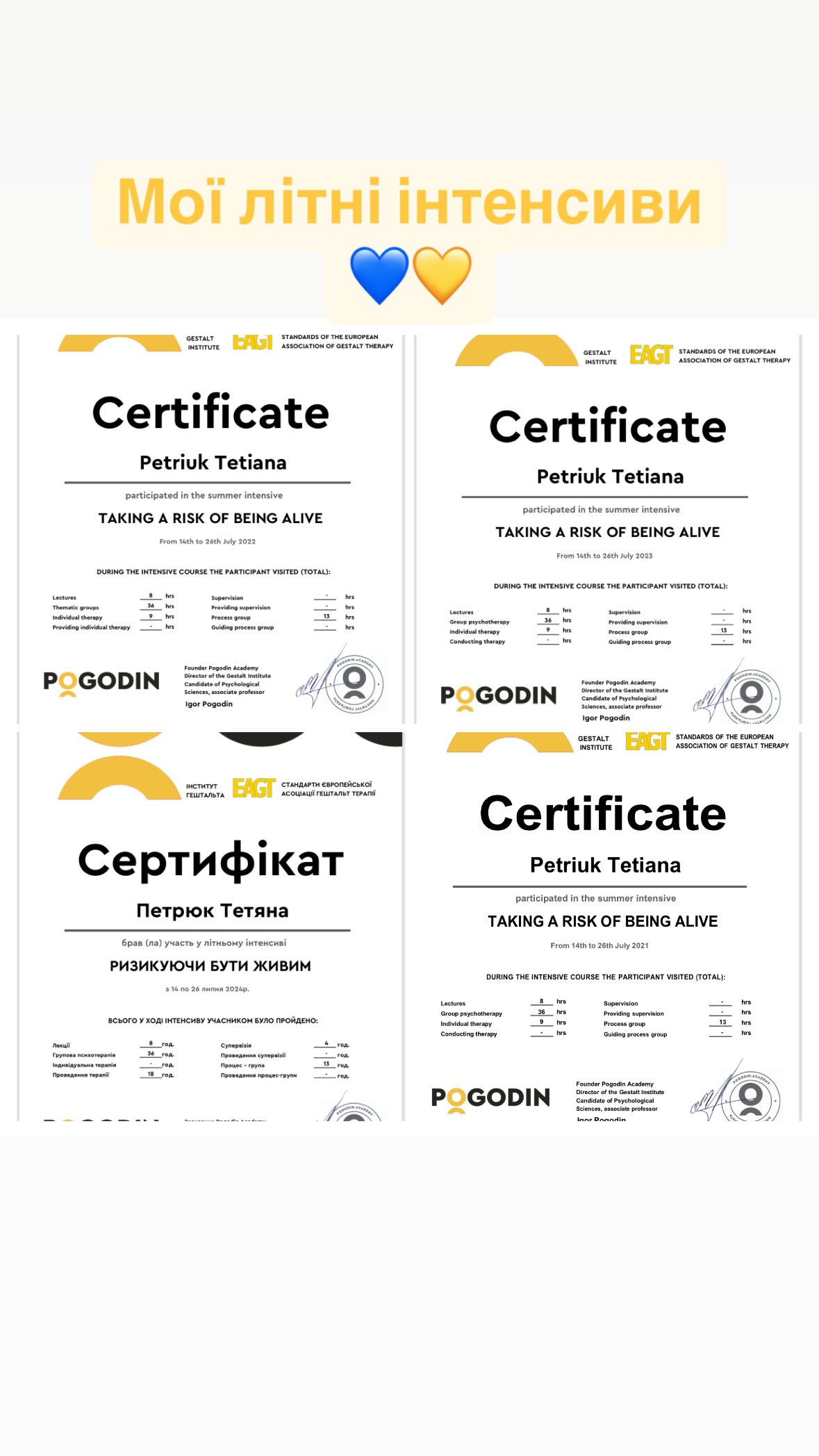 Параллельно поступила в академию Погодина на гештальт-терапевта, где прошла следующие специализации: