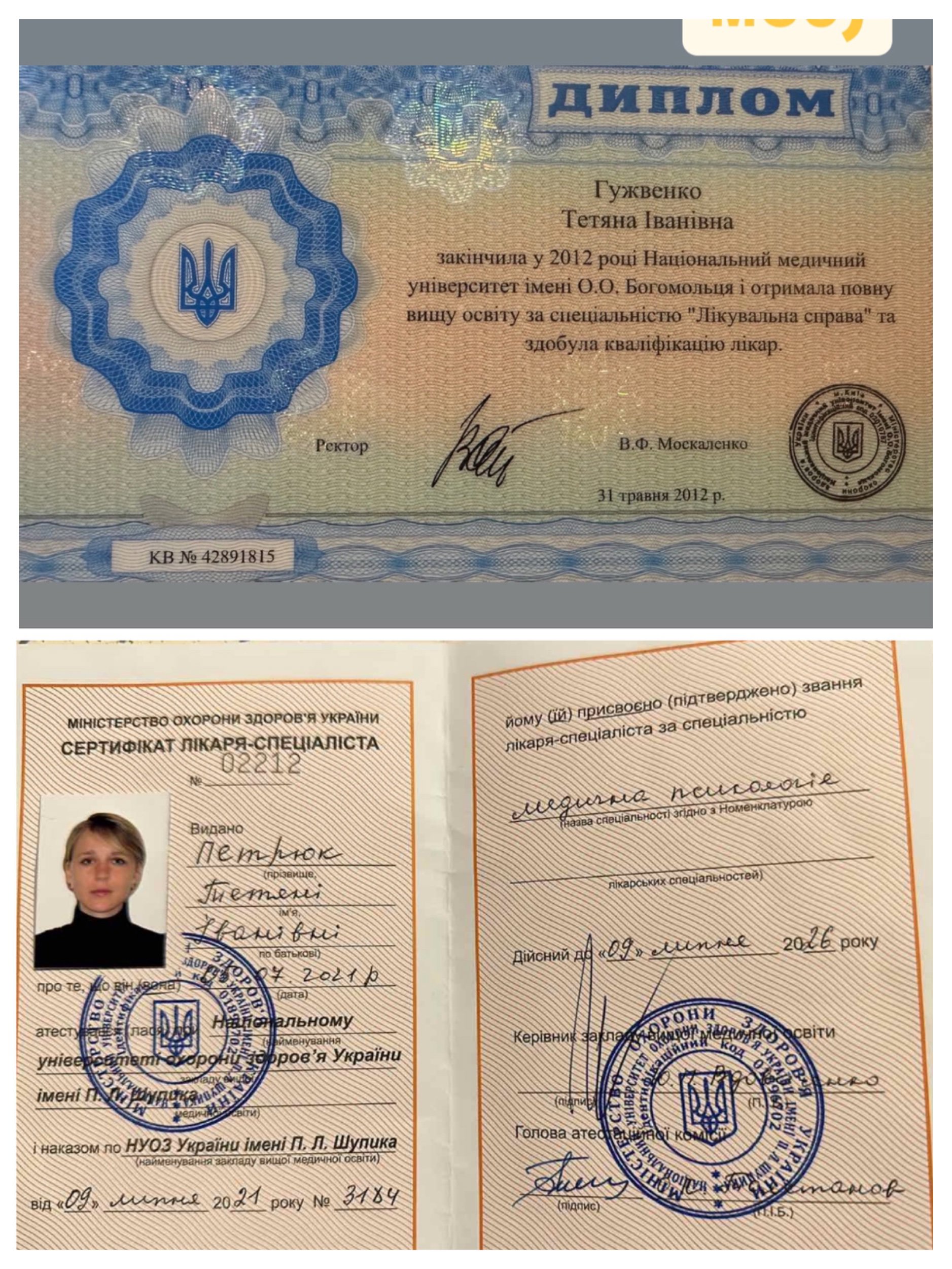 Затем в Национальном университете здравоохранения Украины имени П. Л. Шупика получила специализацию – медицинский психолог.