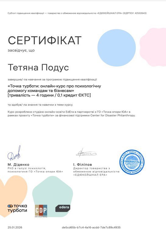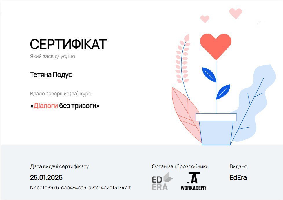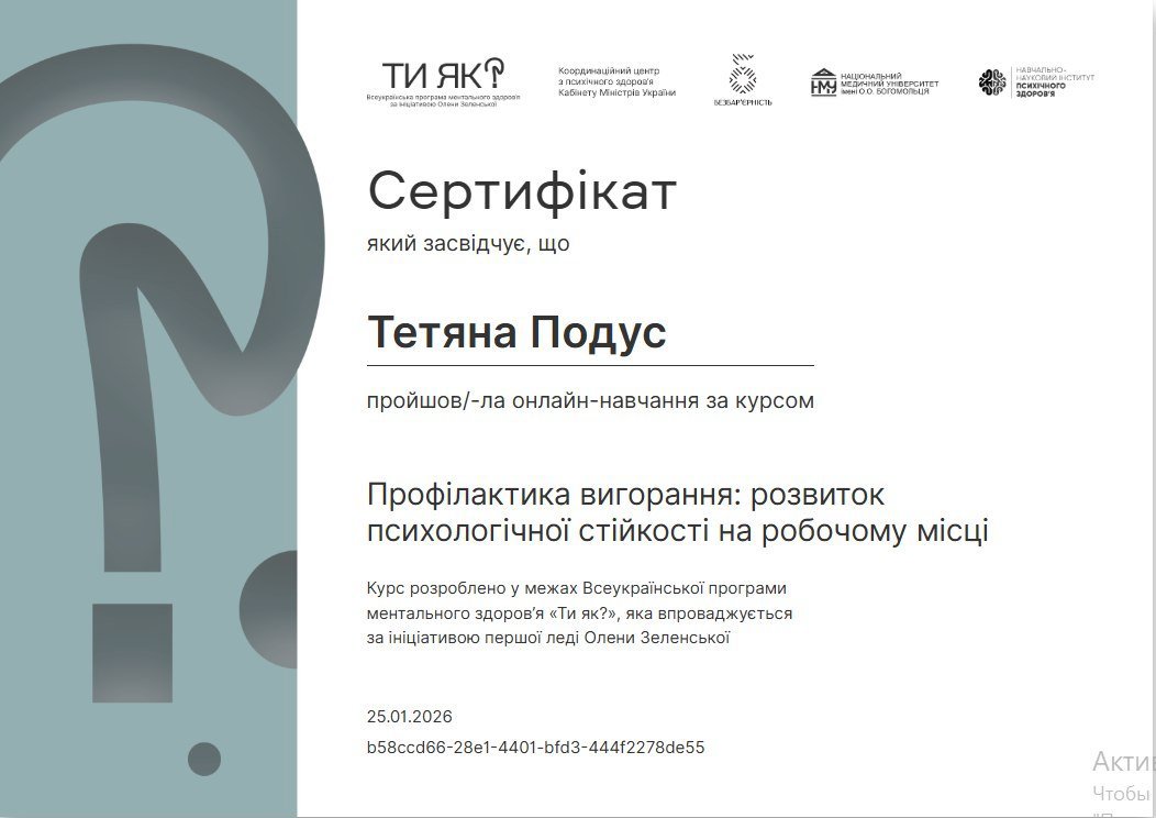 Курс "Профилактика выгорания: развитие психологической стойкости на рабочем месте". Всеукраинская организация ментального здоровья «Ты как?». Продолжительность 10 часов 2026 год