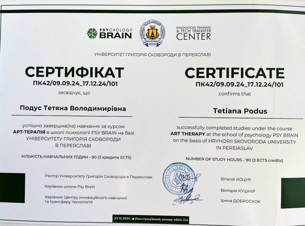 Курс Арт-терапия в школе психологии PSY Brain на базе университета Григория Сковороды в Переяслове 90 ч 2024 год