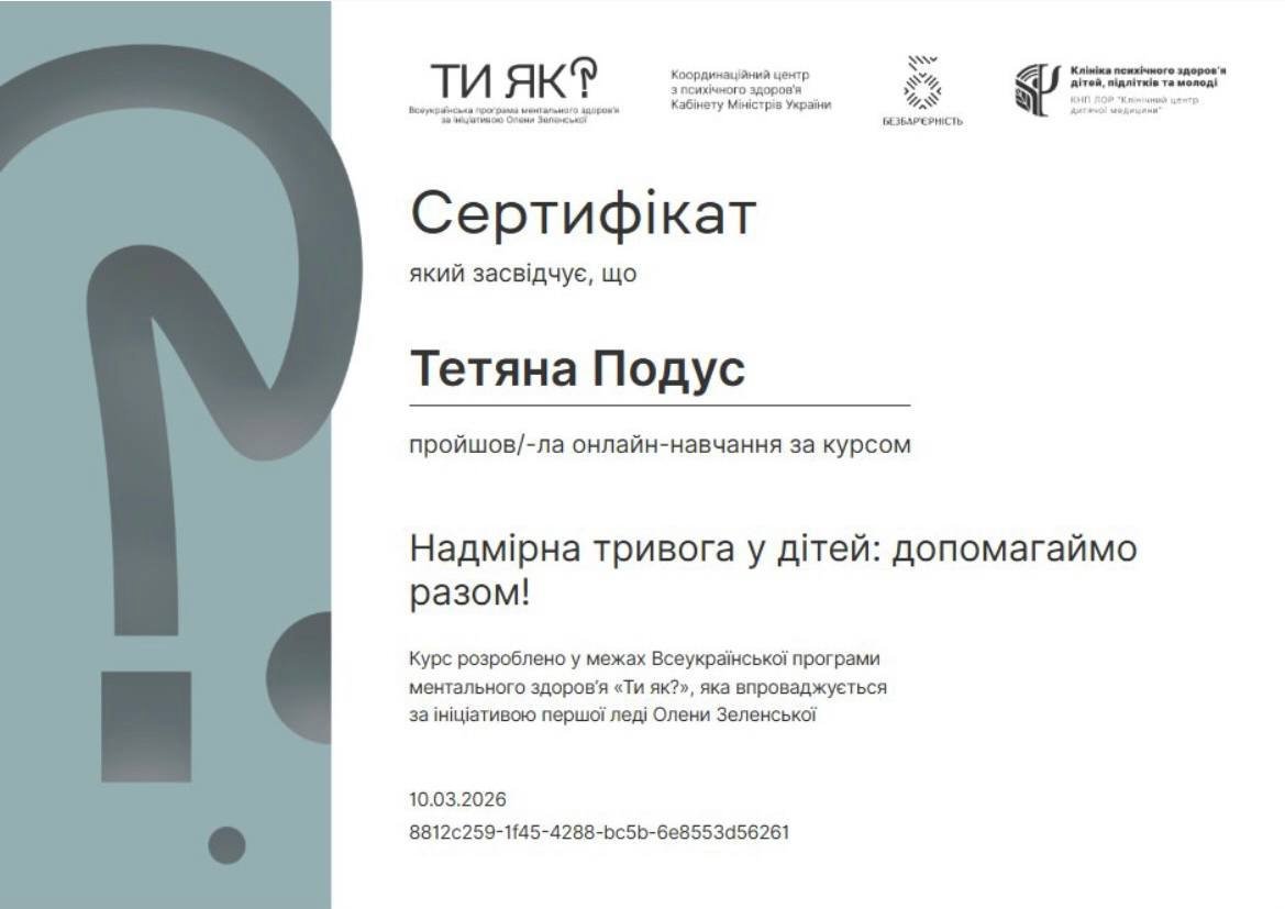 Курс "Чрезмерная тревога у детей: помогаем вместе!" Всеукраинская организация ментального здоровья «Ты как?». Продолжительность 5 часов 2026 год