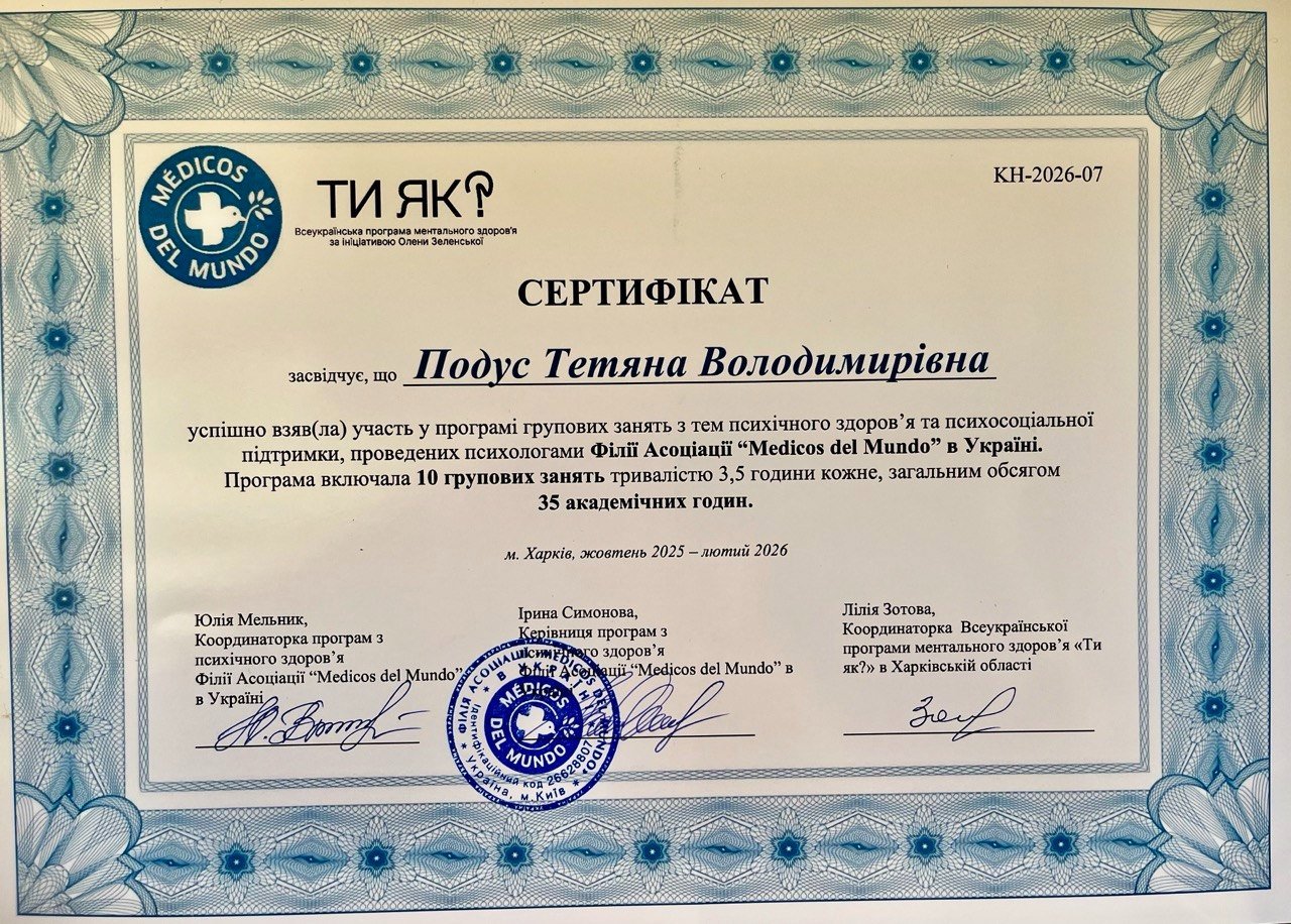 Программа групповых занятий по темам психического здоровья и психосоциальной поддержки, проведенных психологами Филиала Ассоциации “Médicos del Mundo” в Украине. 35 академических часов. 2025-2026