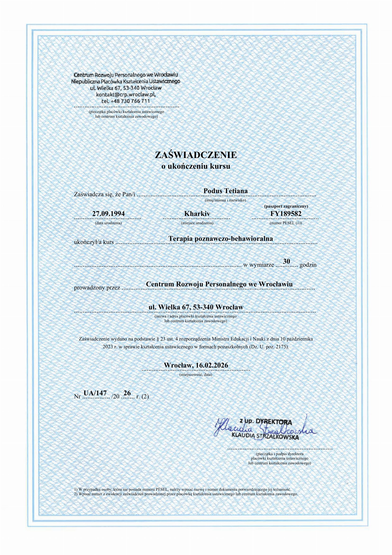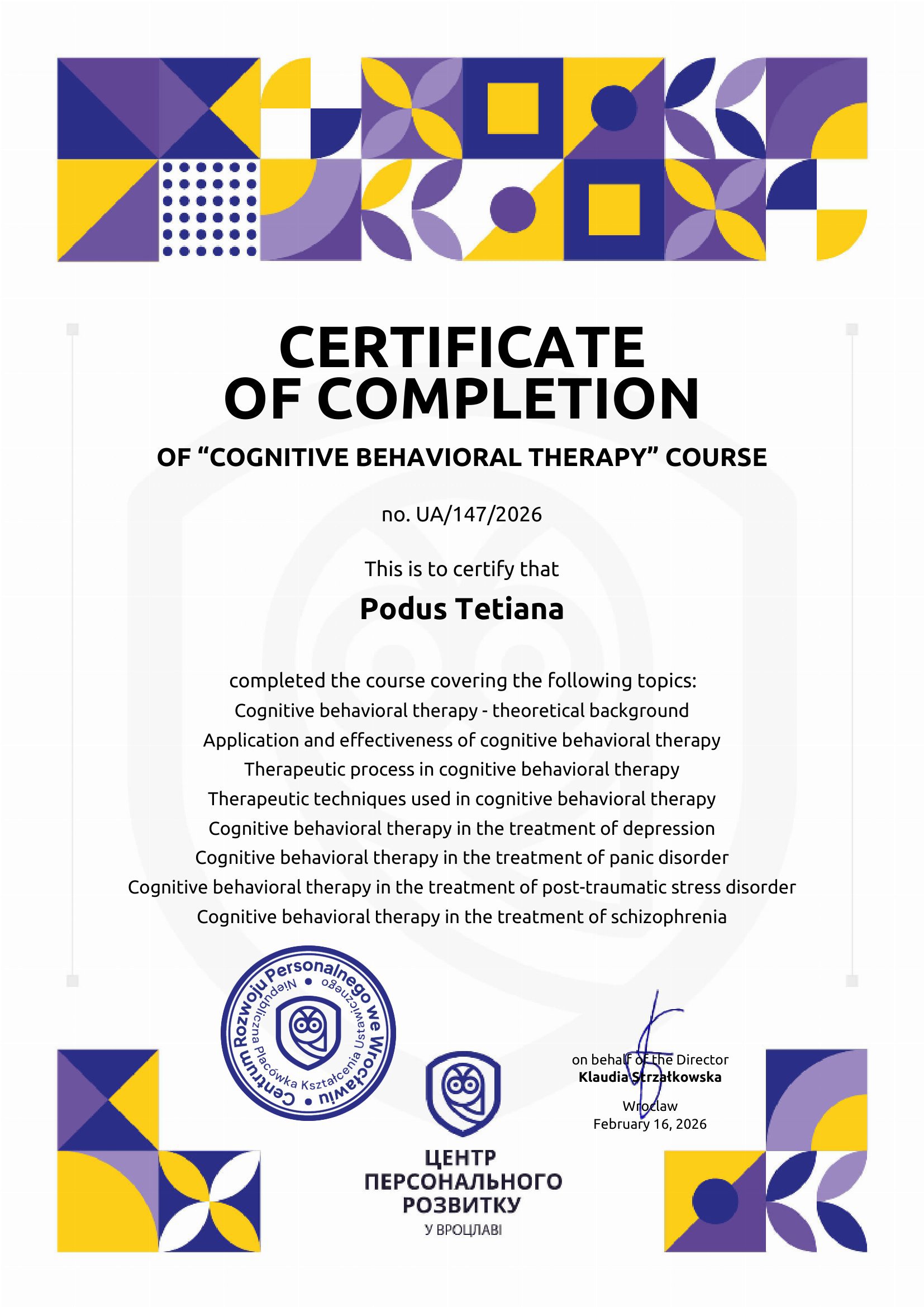 Курс «Когнитивно-поведенческая терапия» в Международном центре персонального развития во Вроцлаве 30 часов 2026