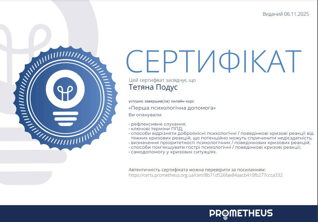 Курс «Первая психологическая помощь» Учебный центр Prometheus на базе международных организаций 20 часов 2025 год