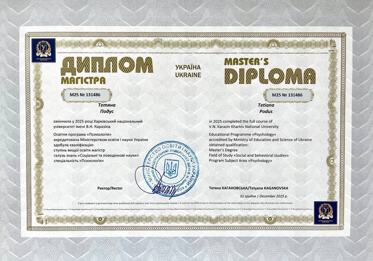 Магистр психологии. Харьковский Национальный университет им. Каразина 2025 год