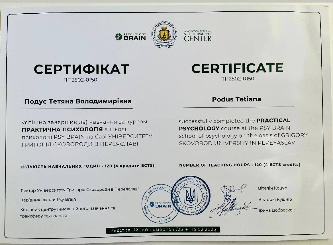 Курс Практическая психология в школе психологии PSY Brain на базе университета Григория Сковороды в Переяслове 120 ч 2024 год