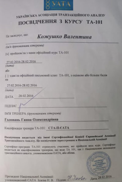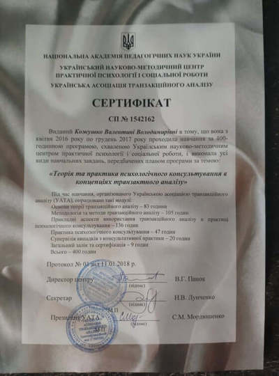 Закінчила Донецький інститут психології і підприємництва. Чотирирічний курс Транзактного аналізу.