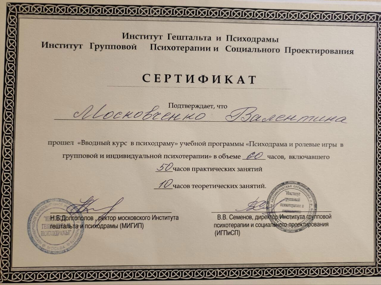 Психодрама терапевт (МИГИП) 980 часов 2013 года сертификации.