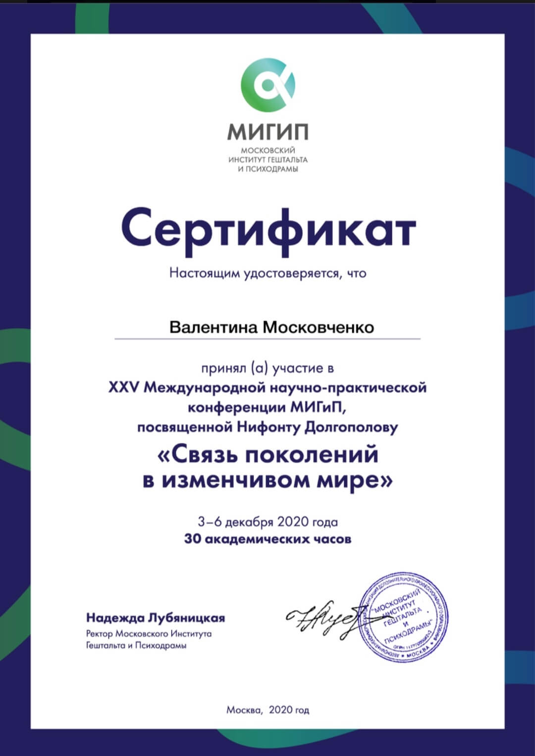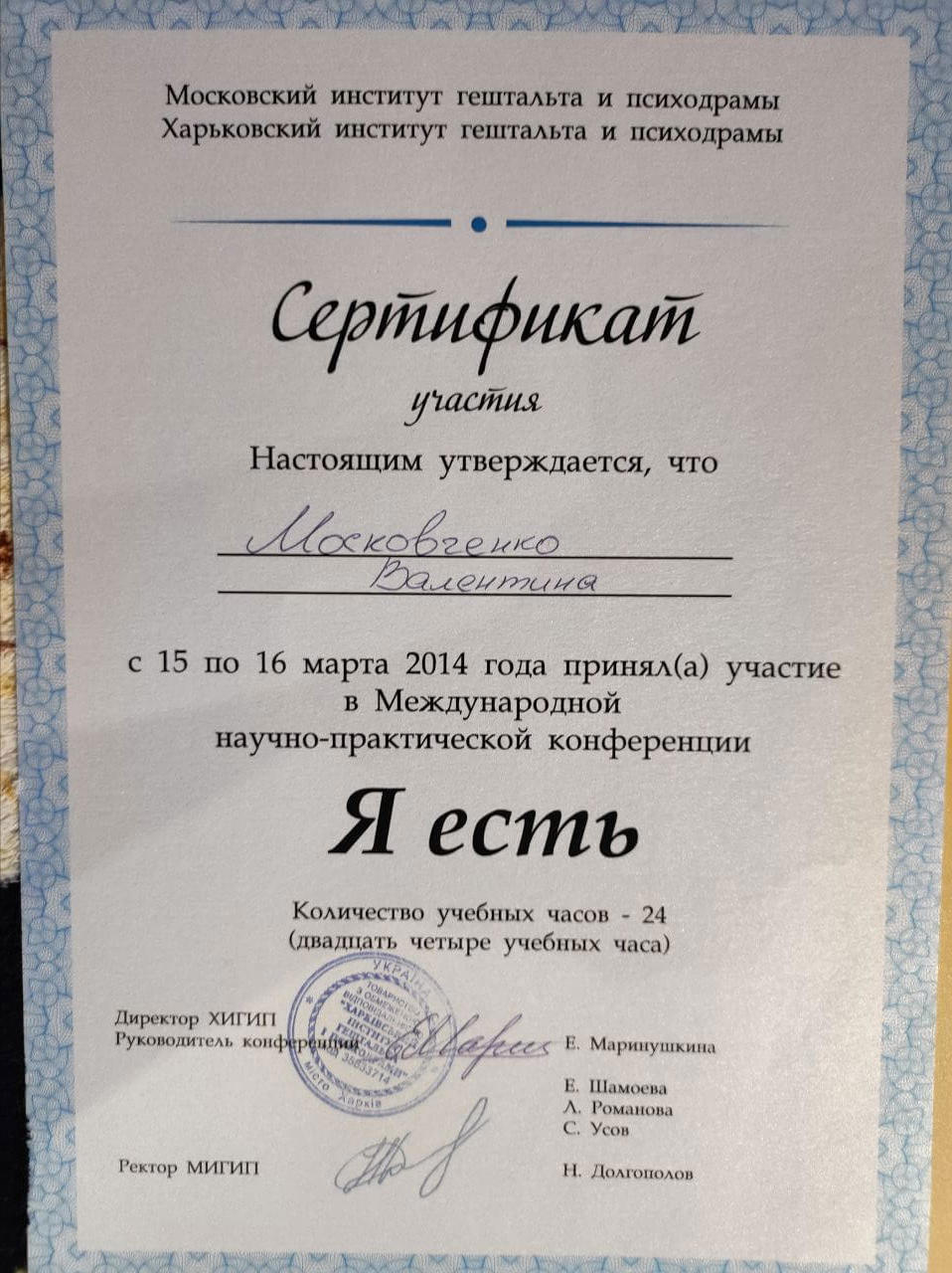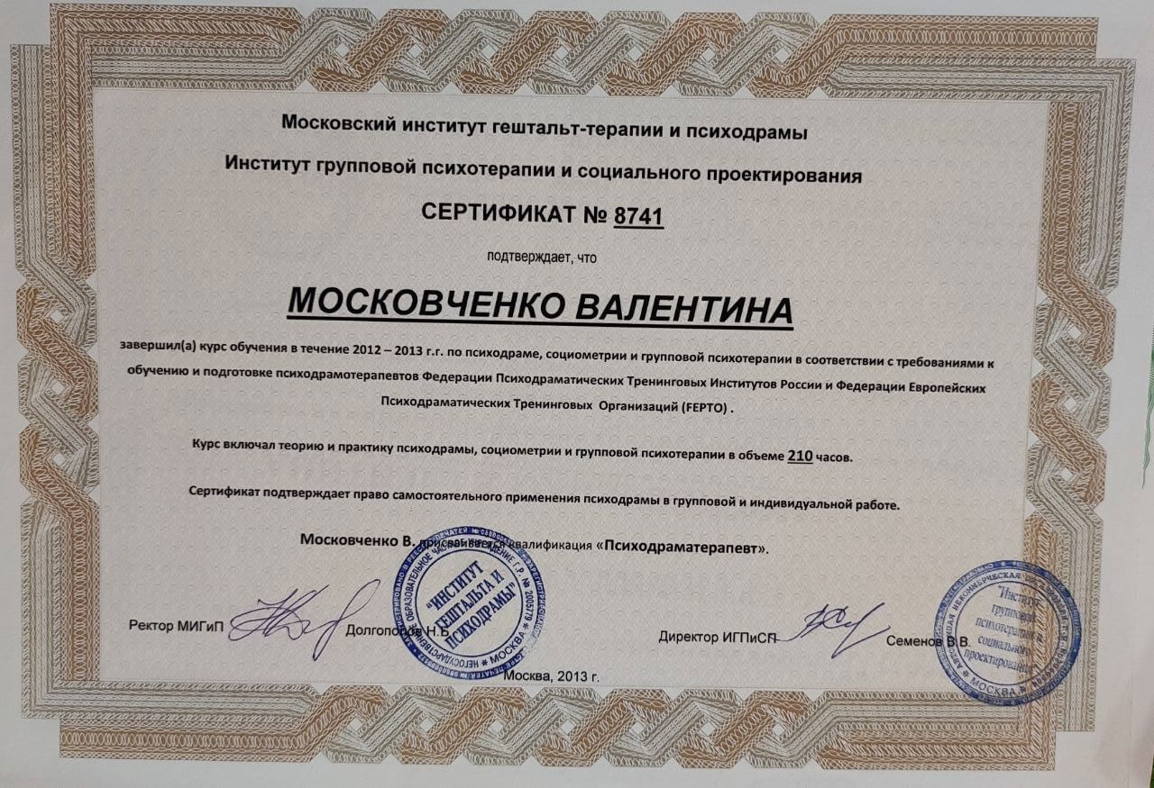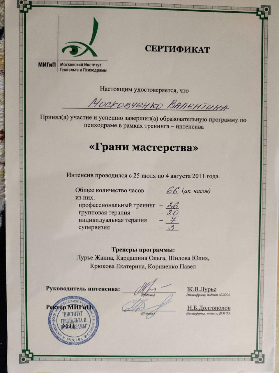 Психодрама терапевт (МИГИП) 980 часов 2013 год сертификации.