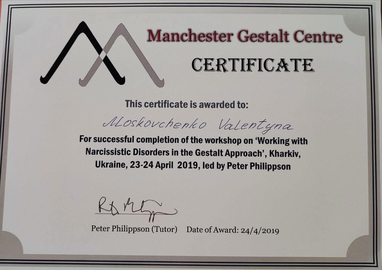 Гештальт – законченная 1 степень (2017 г.) МИГИП, 2 степень завершена (2022 г.) КИГИП.
