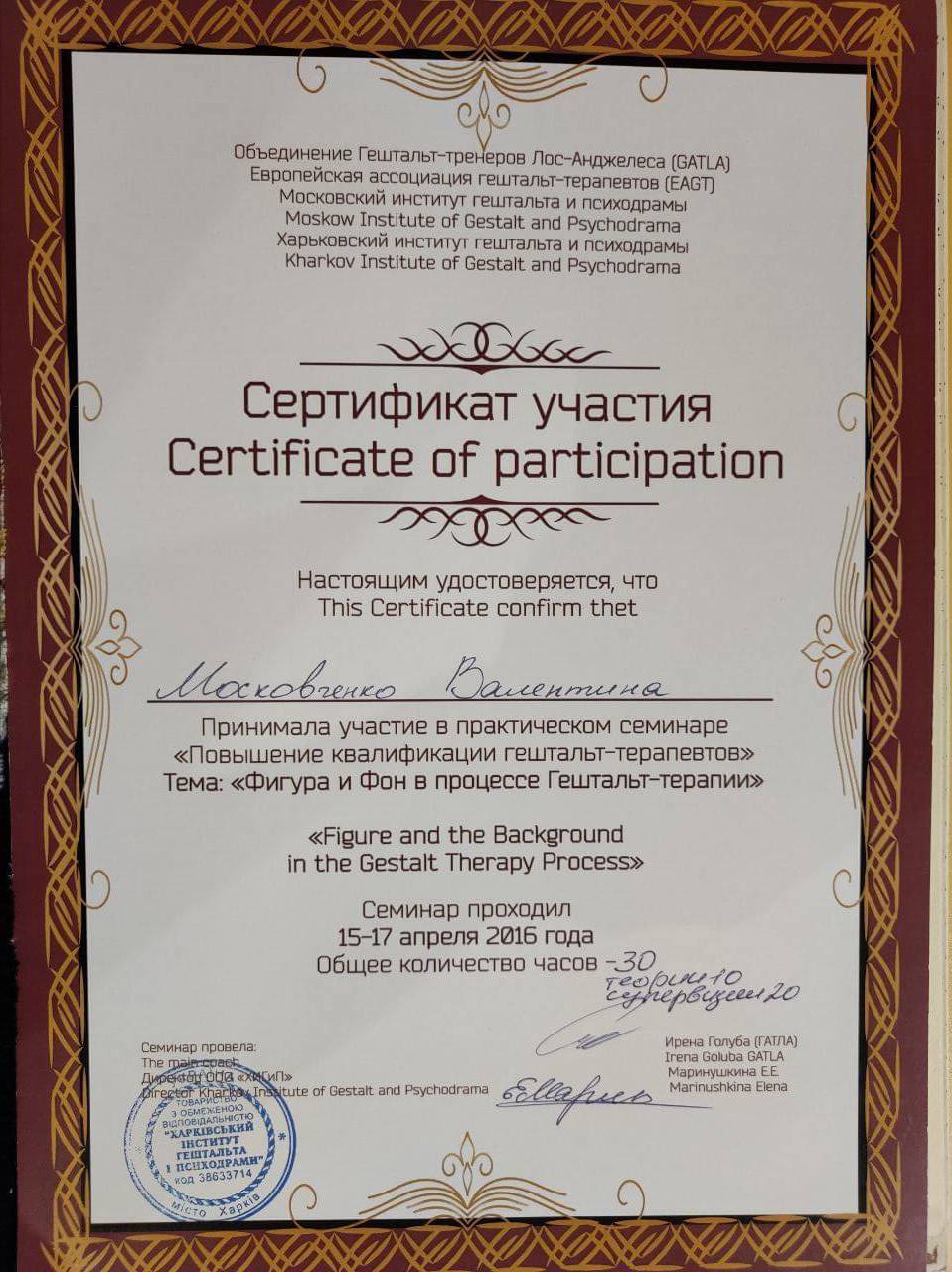 Гештальт - оконченная 1 ступень (2017 г.) МИГИП, 2 ступень в 2022 году защита, МИГИП.