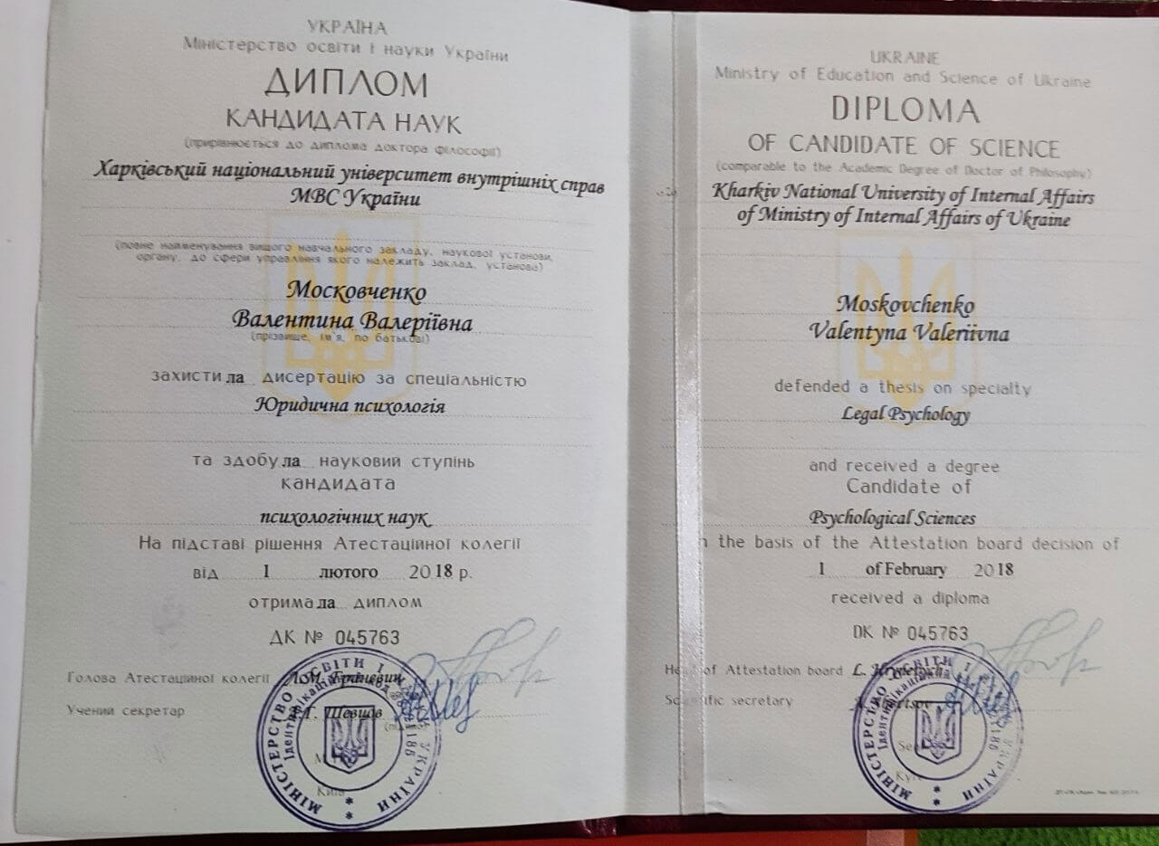 Оконченное высшее образование психолога, квалификации бакалавр, специалист, магистр. Кандидат психологических наук (2018 год).