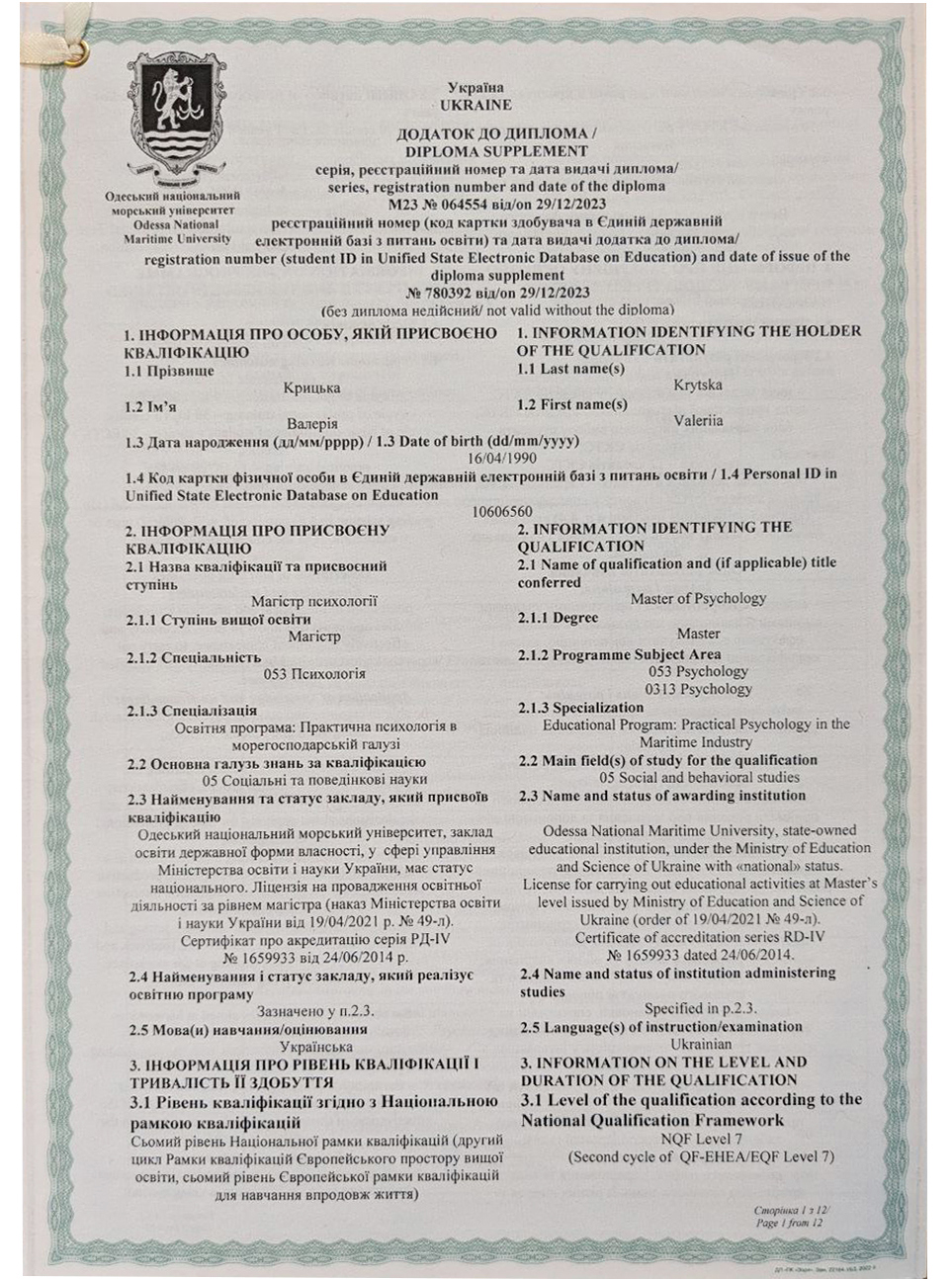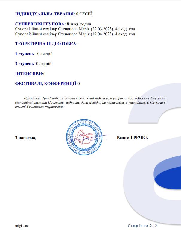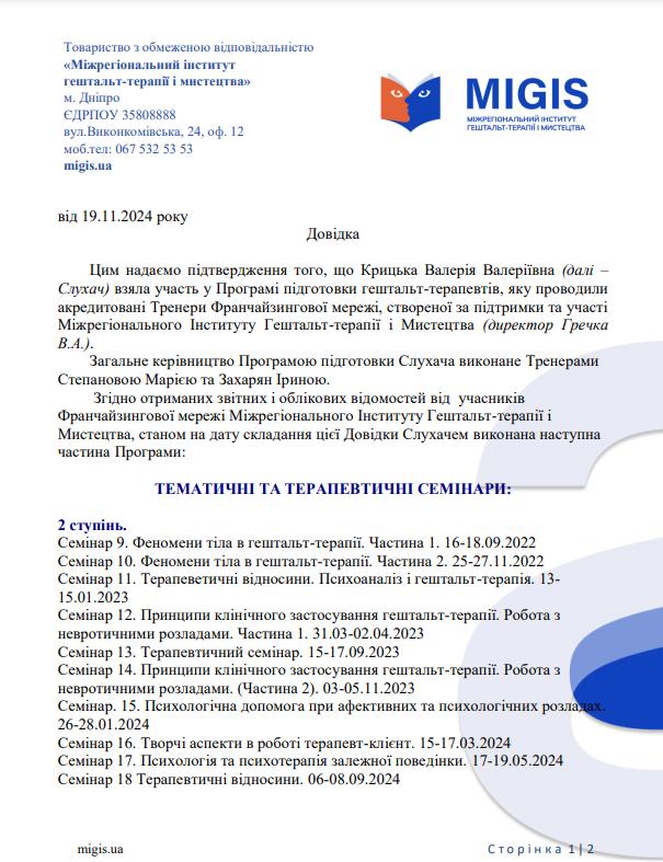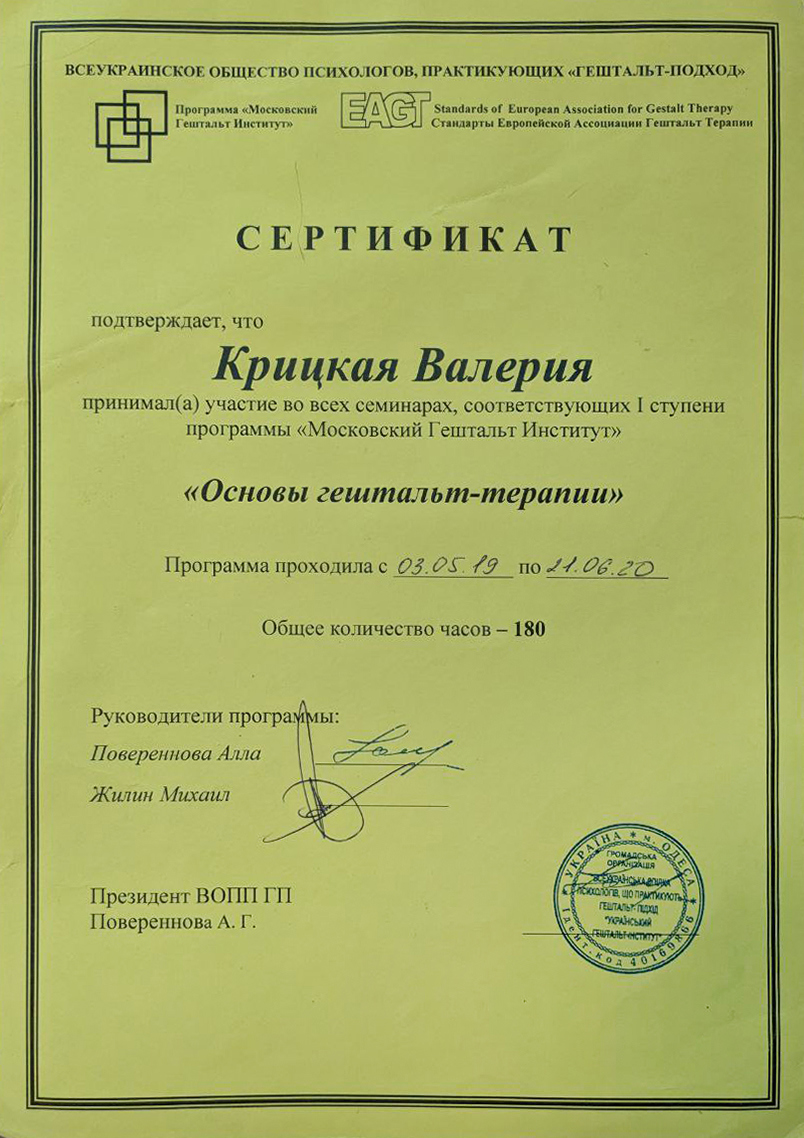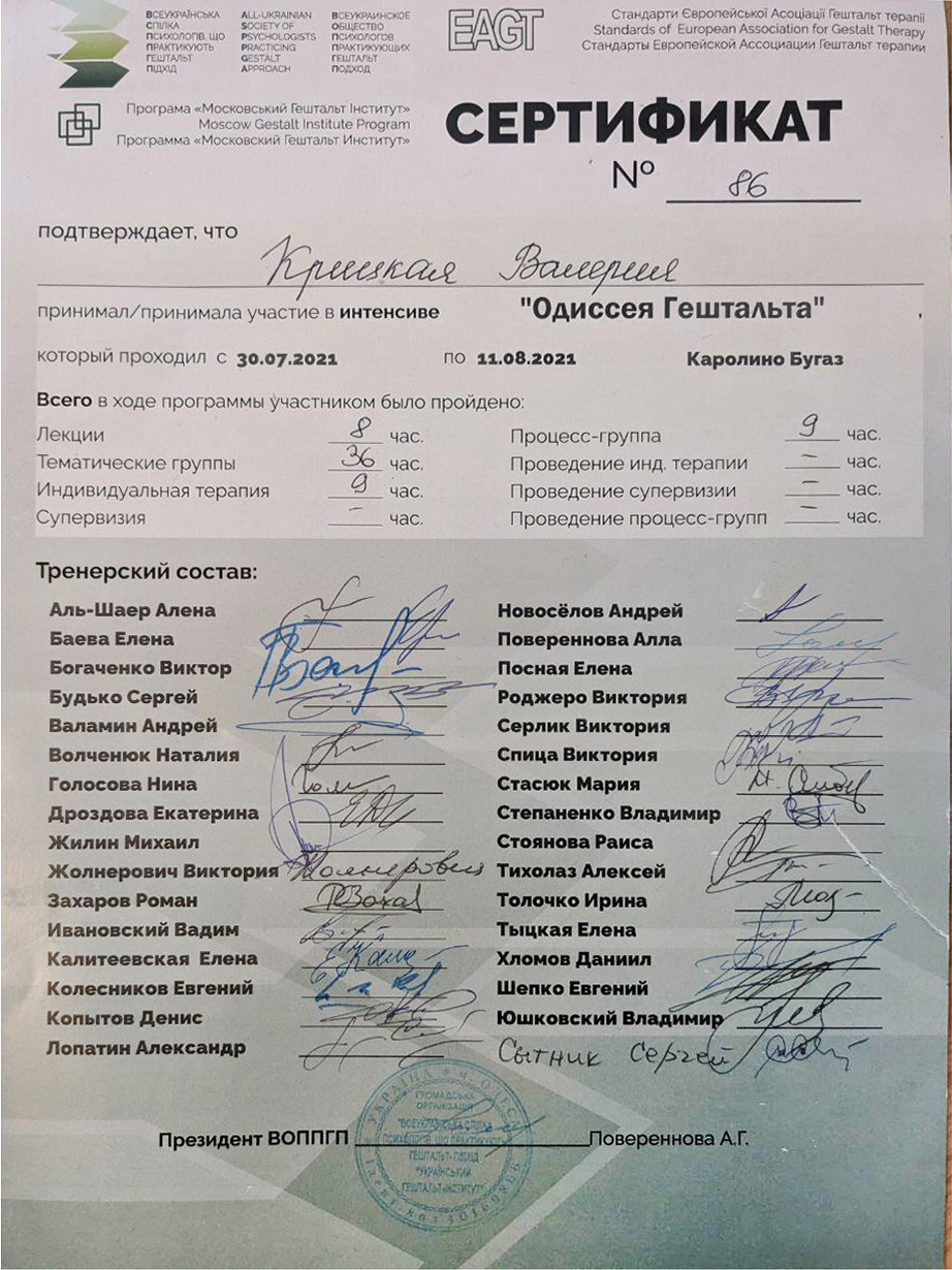 Окончила первую степень программы подготовки гештальт-терапевтов в ВОПППГП