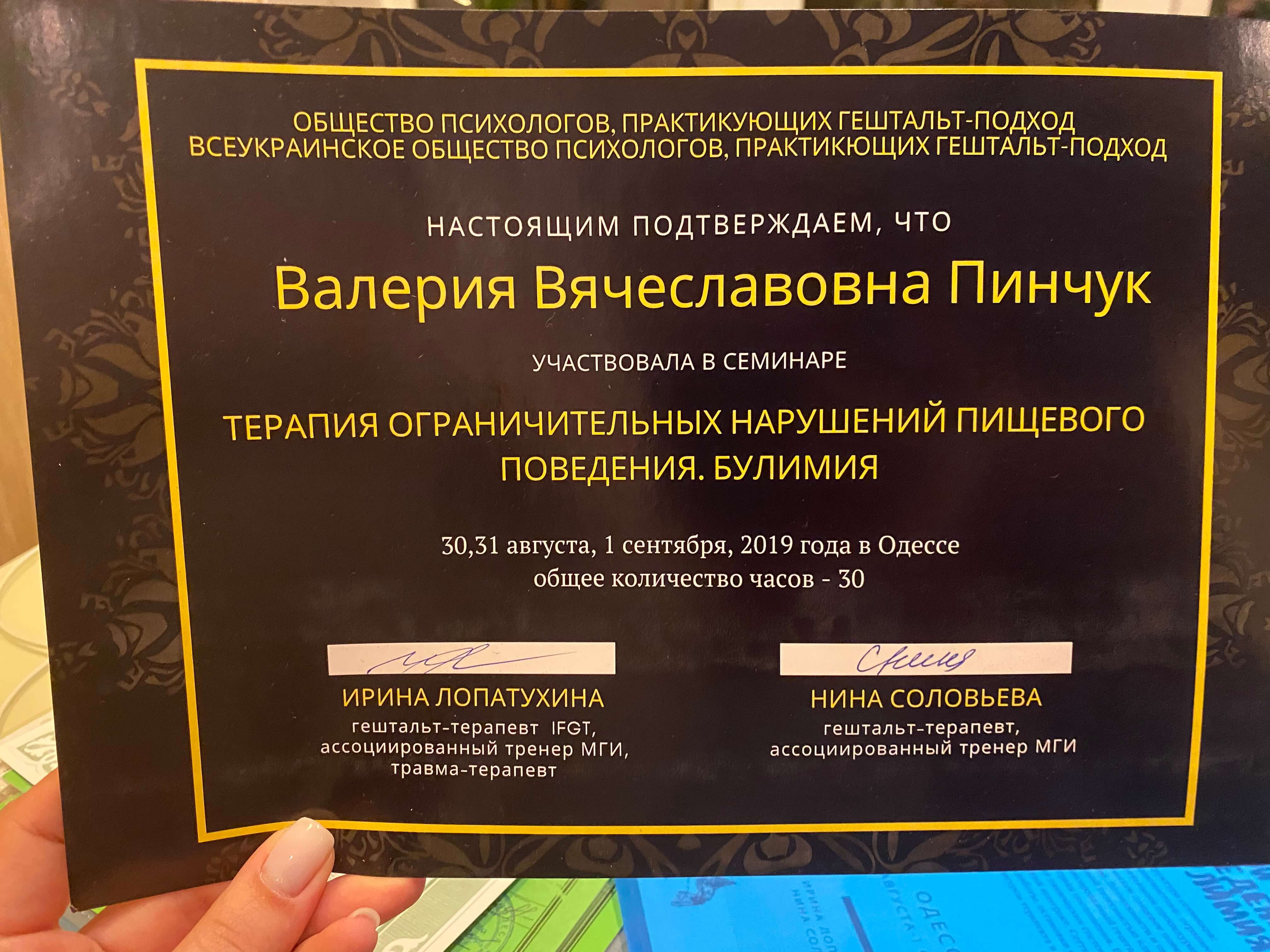 Сейчас я учусь на "Смеха-терапии" и параллельно прохожу повышение квалификации в работе с расстройствами пищевого поведения)