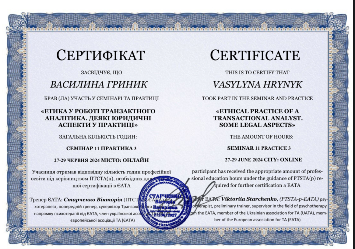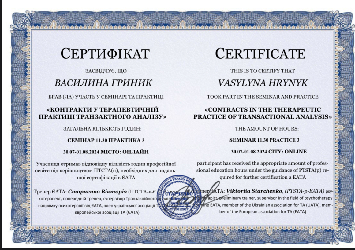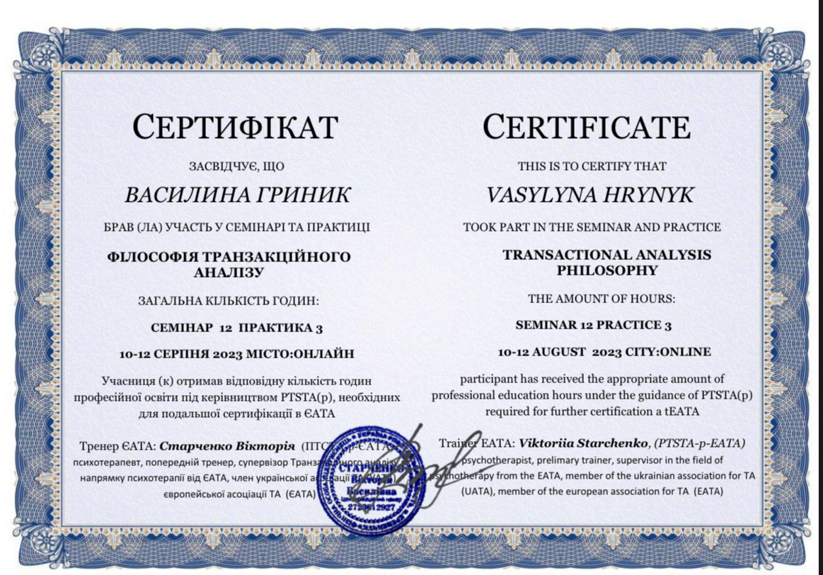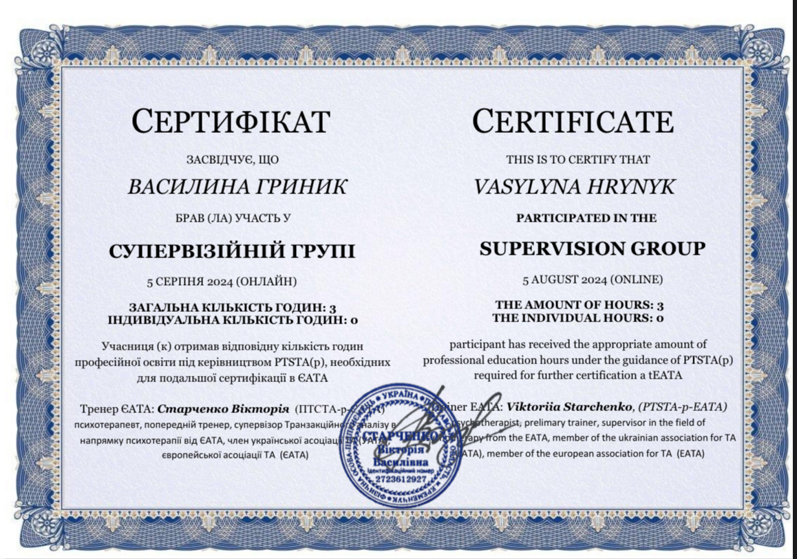Я продолжаю свое обучение на психотерапевта методом ТА и начала посещать супервизии для грамотной и профессиональной помощи клиентам. Я считаю это важным элементом психологической деятельности и возможности для орошения своей профессиональной компетентности.