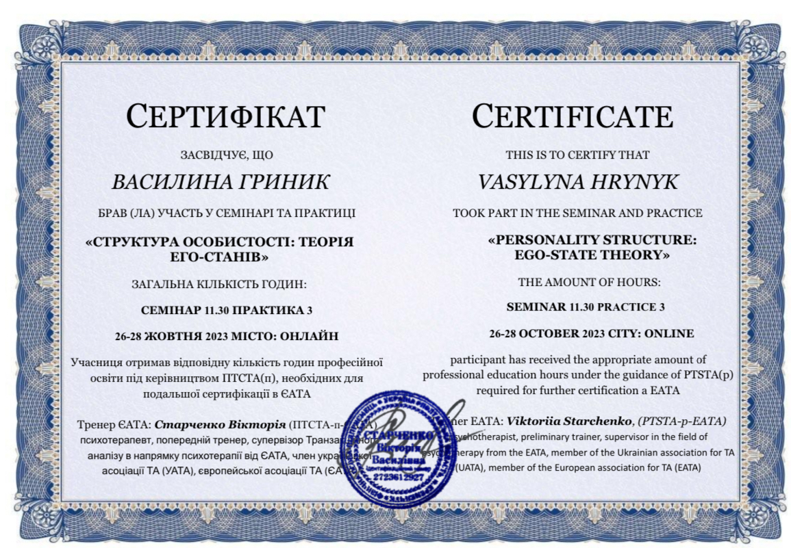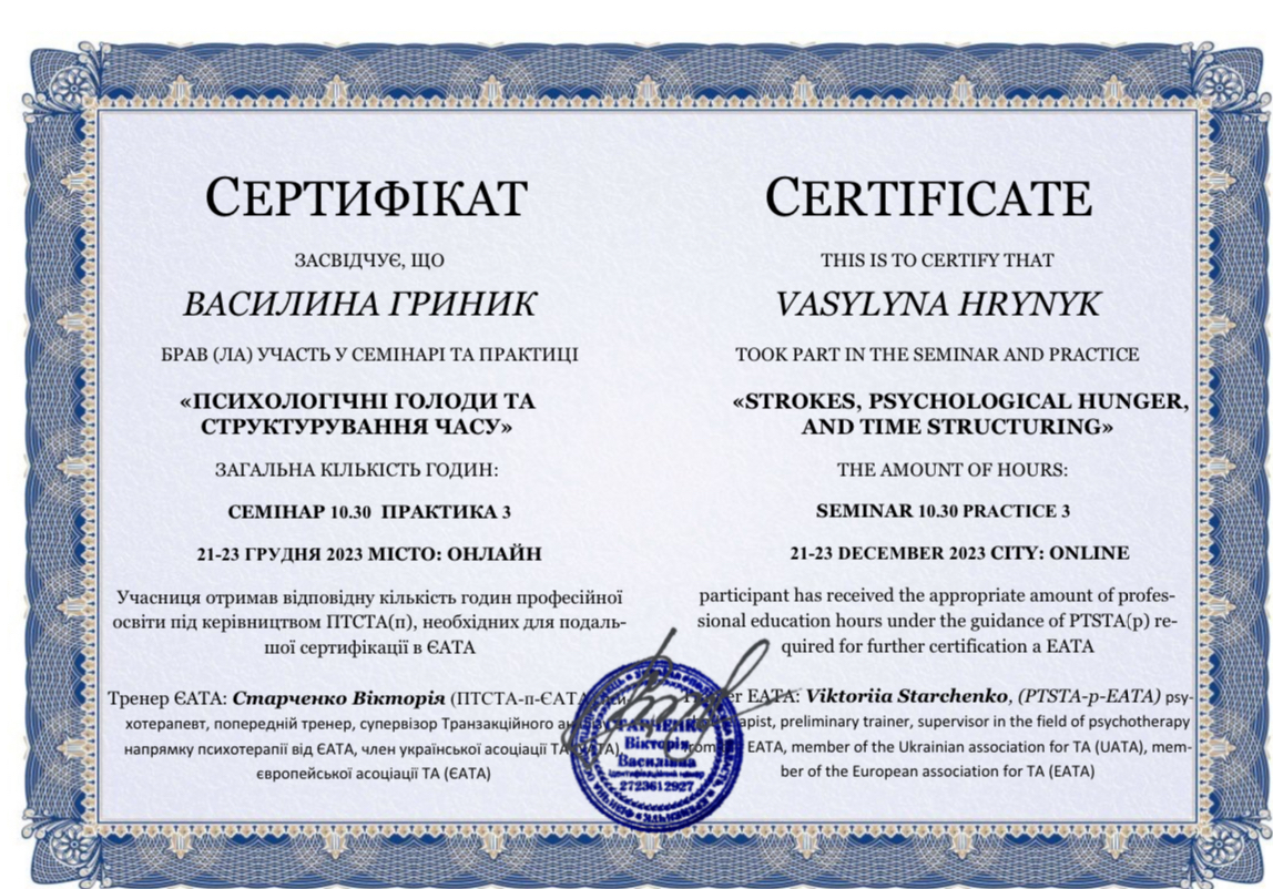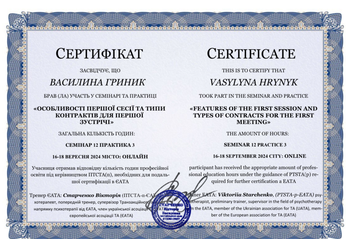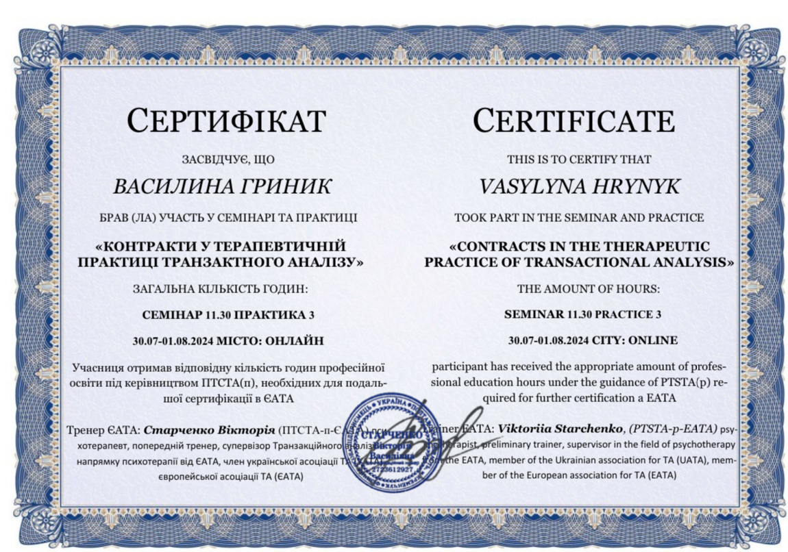 Я продолжаю свое обучение на психотерапевта методом ТА и начала посещать супервизии для грамотной и профессиональной помощи клиентам. Я считаю это важным элементом психологической деятельности и возможности для орошения своей профессиональной компетентности.