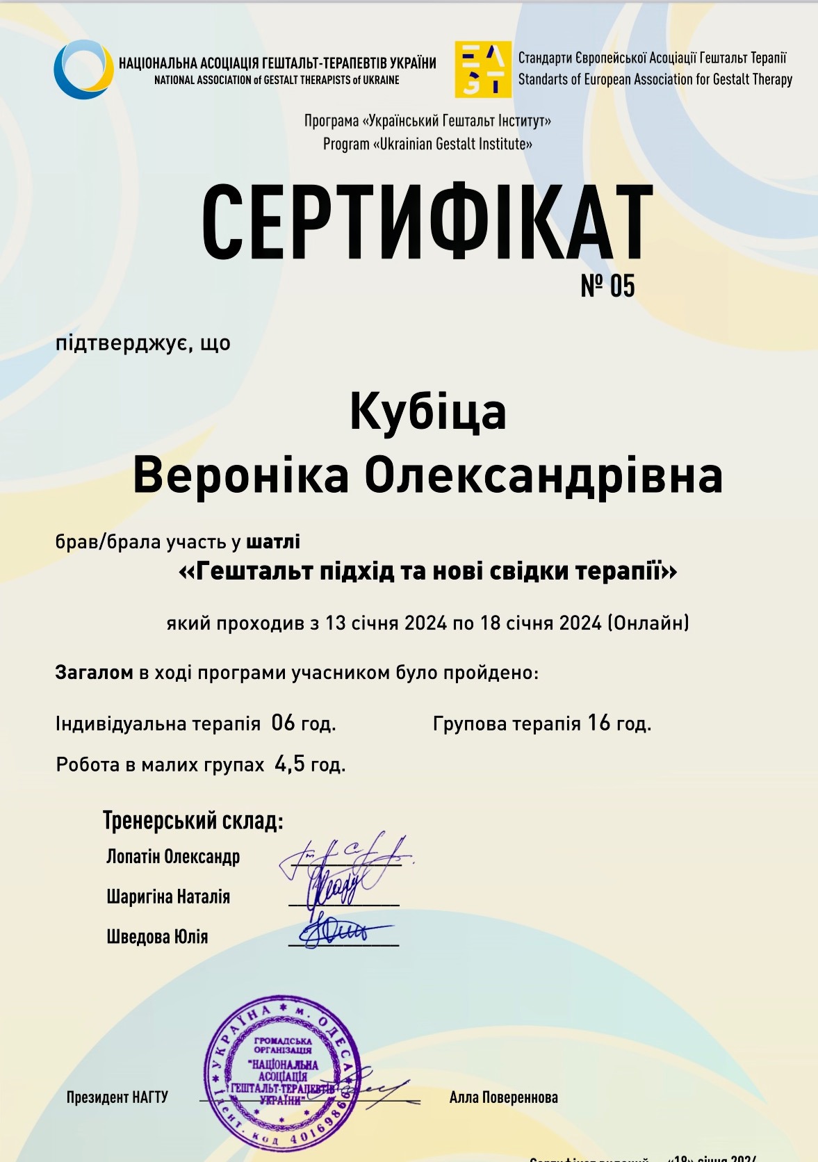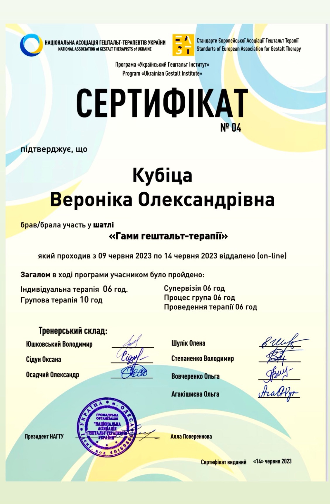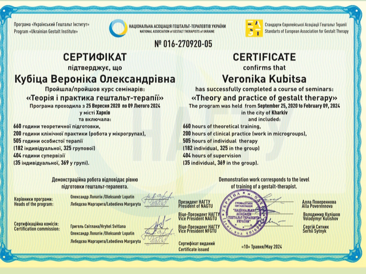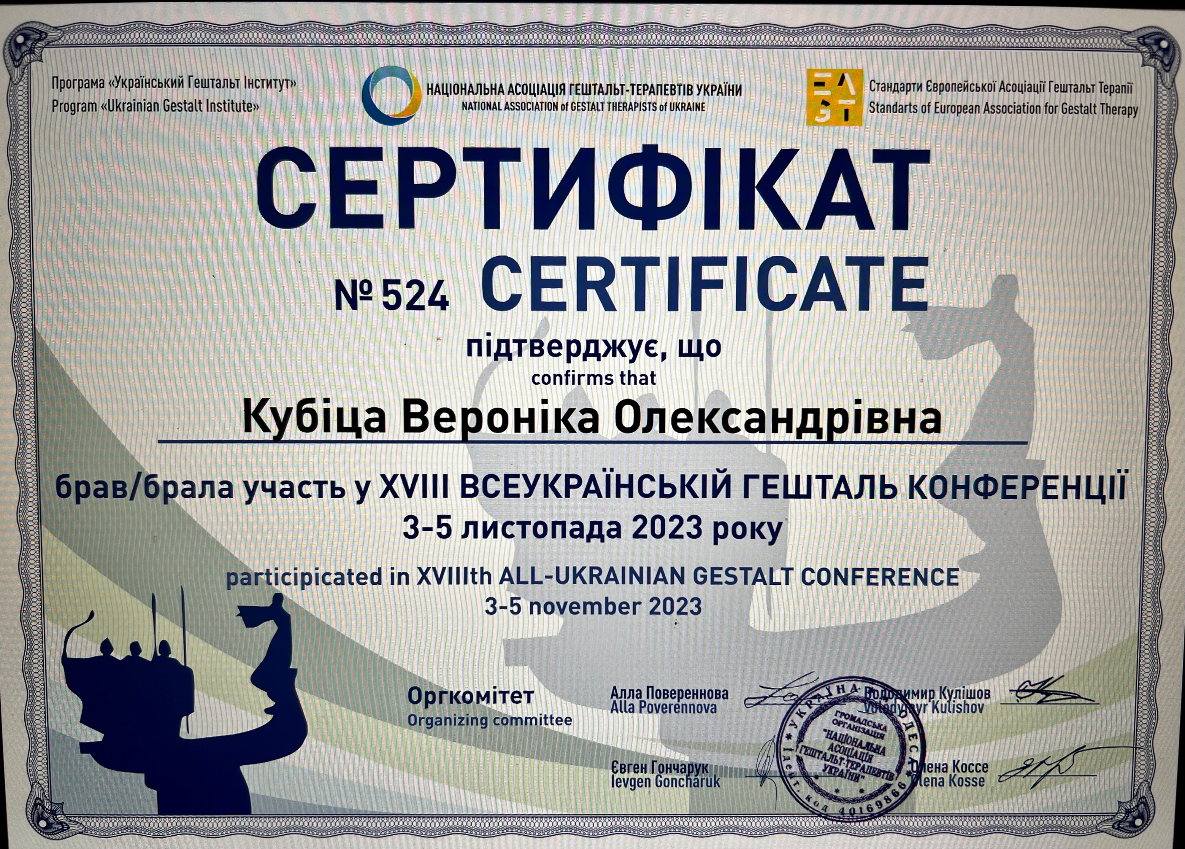 Украинский Гештальт институт с 2018 года - наст время. Студент 2 ступени