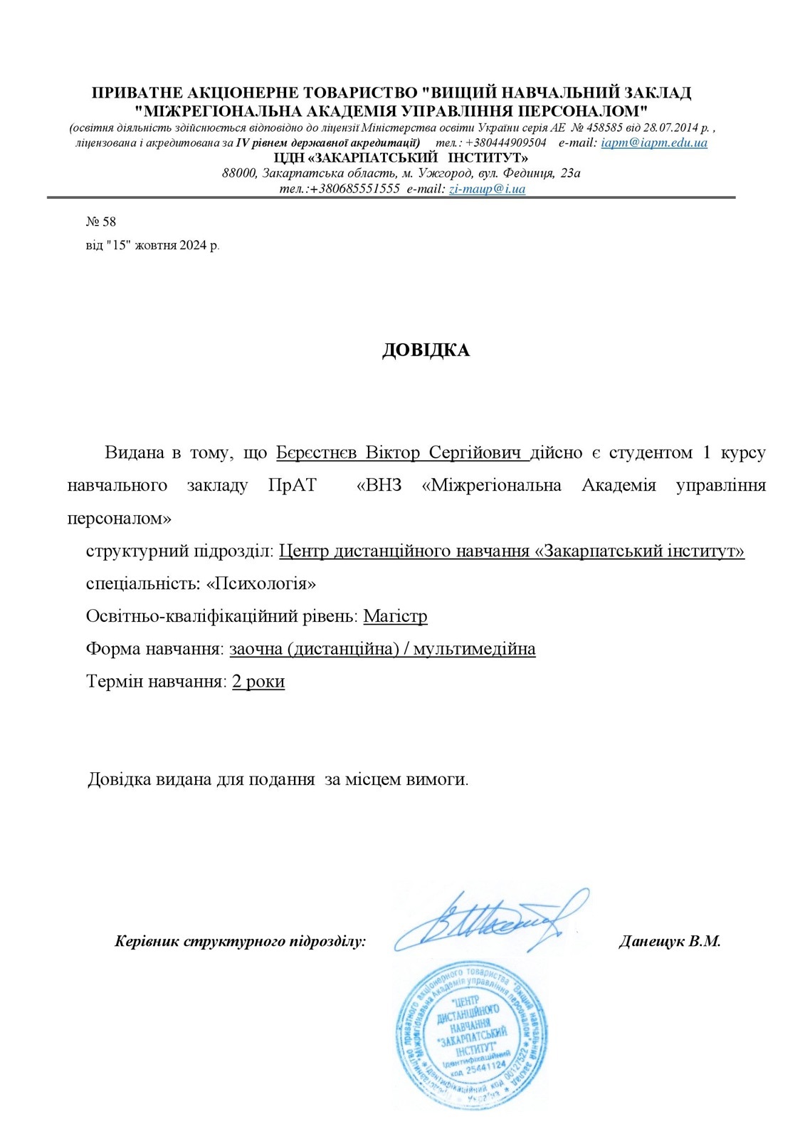 Я учусь на II ступени Киевского Института Гештальта и Психодрамы и в магистратуре психологии. Я завершил специализацию по пропедевтике психиатрии, имею стабильную и многолетнюю личную терапию, и получаю регулярное супервидение. Кроме того, я посещаю глазные интенсивы по гештальт-терапии, интервизионной группе и завершил курс по военной психологии от ГО Майндгард и ГО Хмара.
