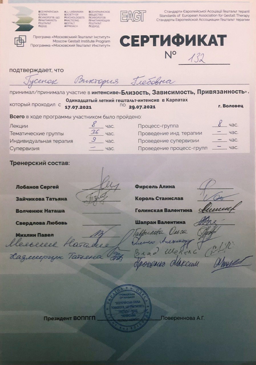 Меня зовут Виктория, я дипломированный психолог и сертифицированный психотерапевт в гештальт-подходе. Имею 3-летнюю постоянную практику, специализацию по возрастным кризисам и теории развития, продолжаю обучение на клинической специализации).