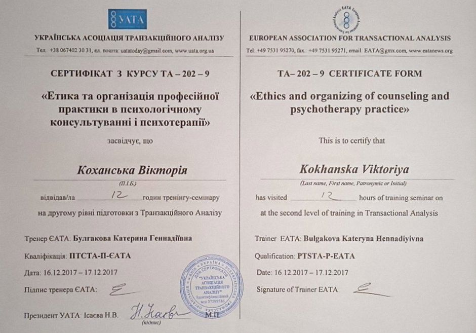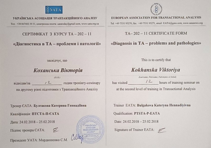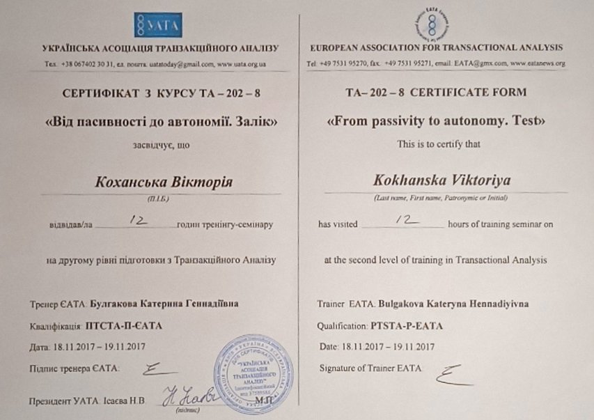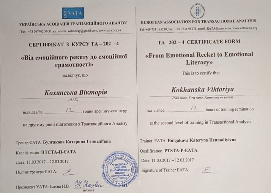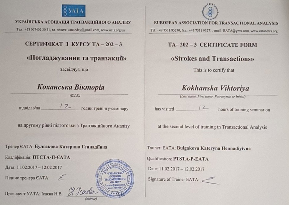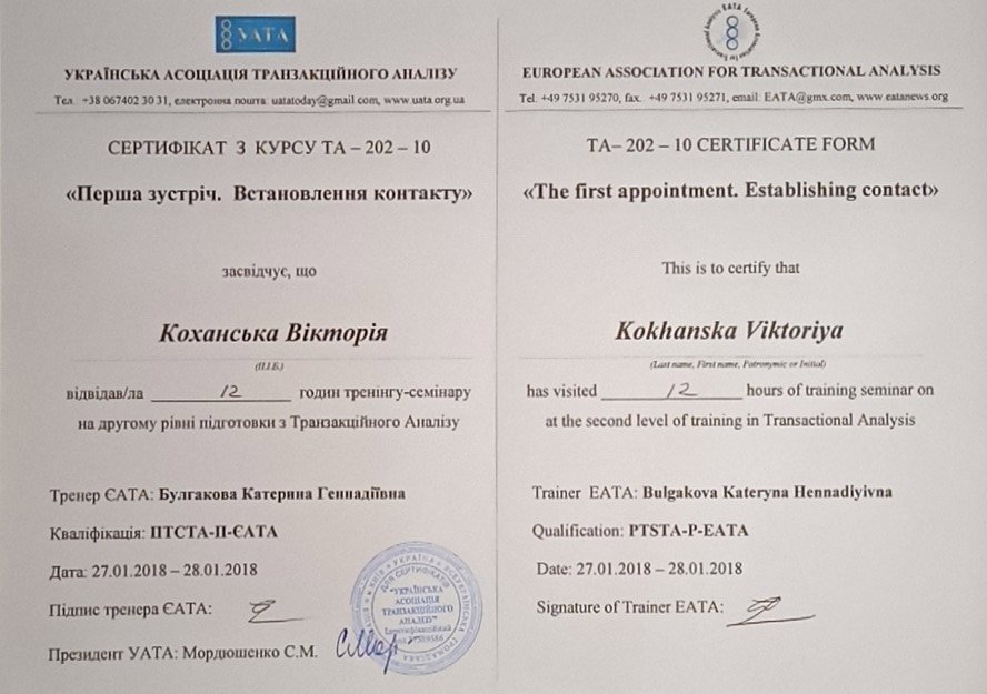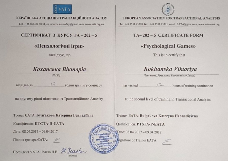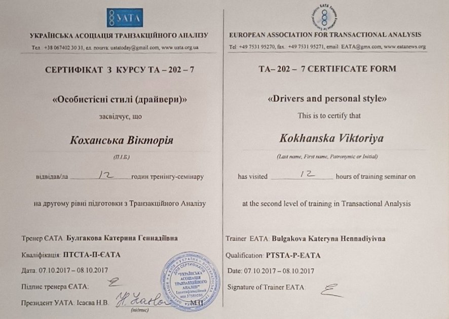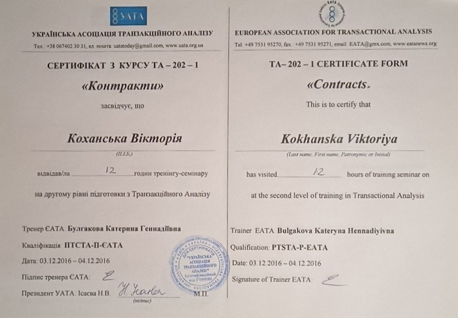 Украинская Ассоциация Транзакционного Анализа, в обучении (4г) подготовки в методе ТА по направлению Психотерапия.