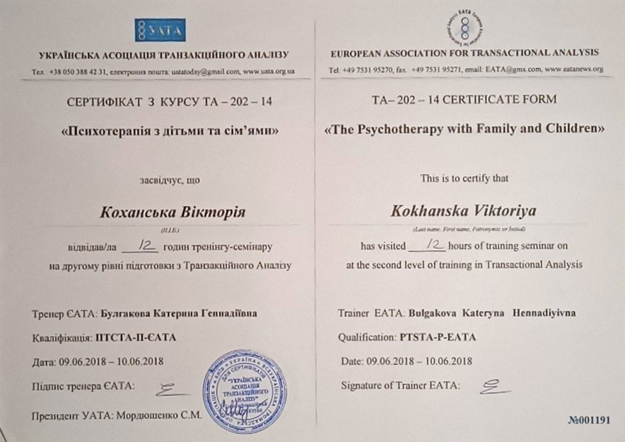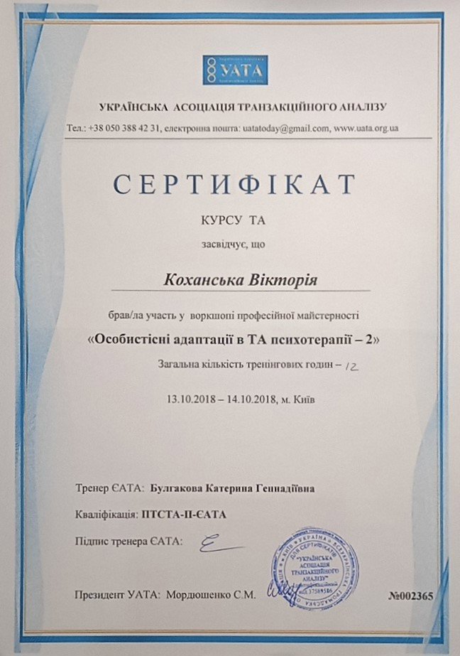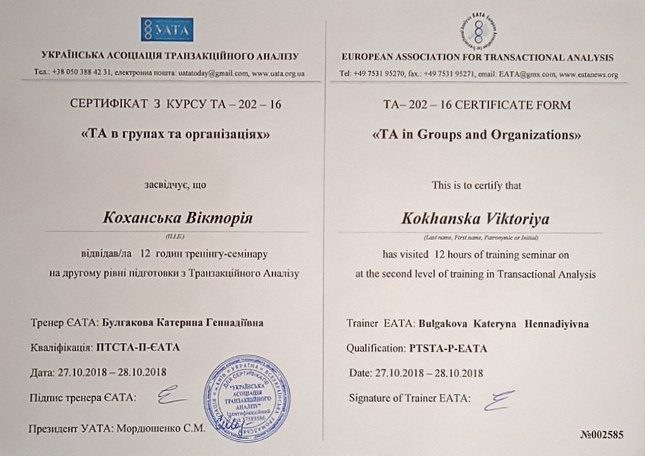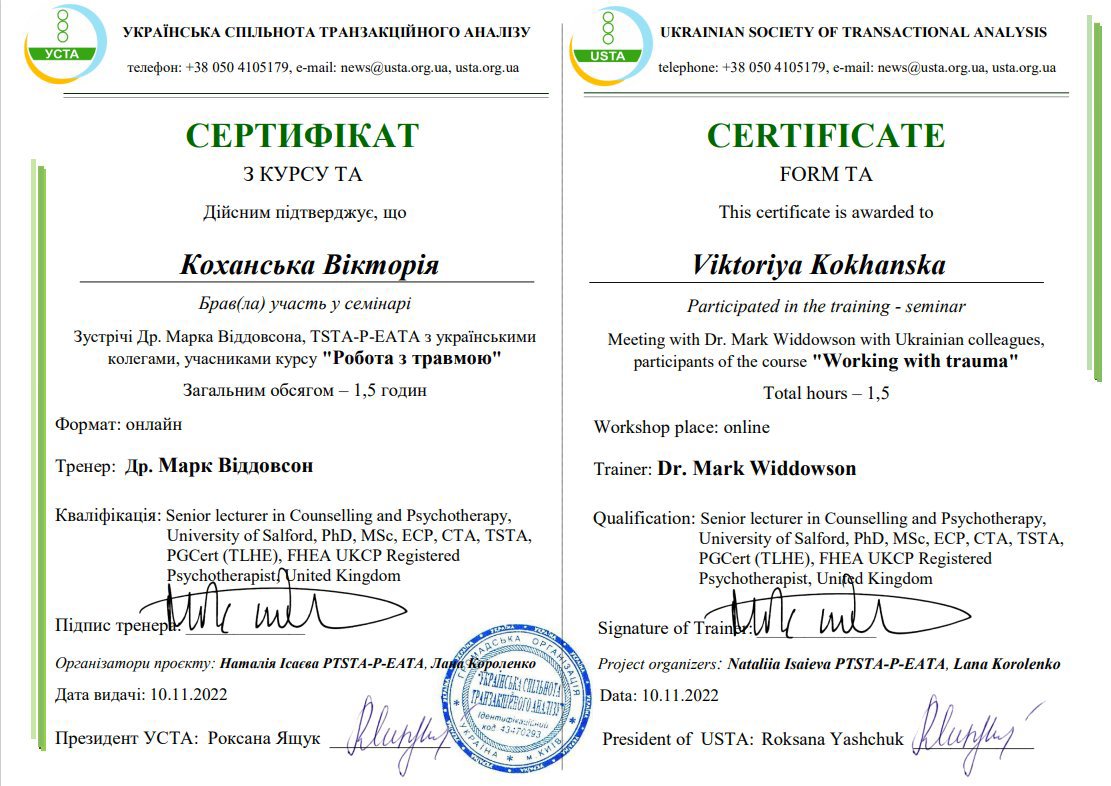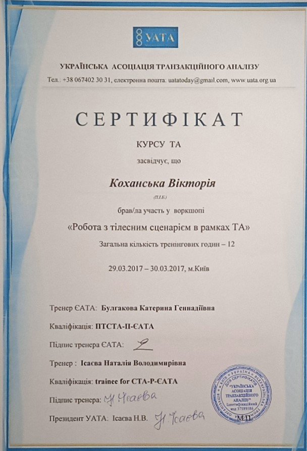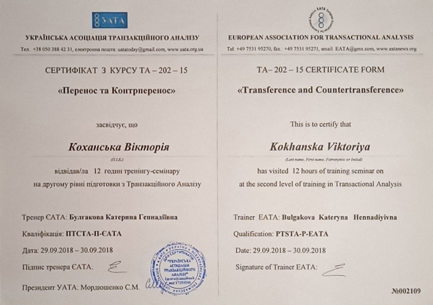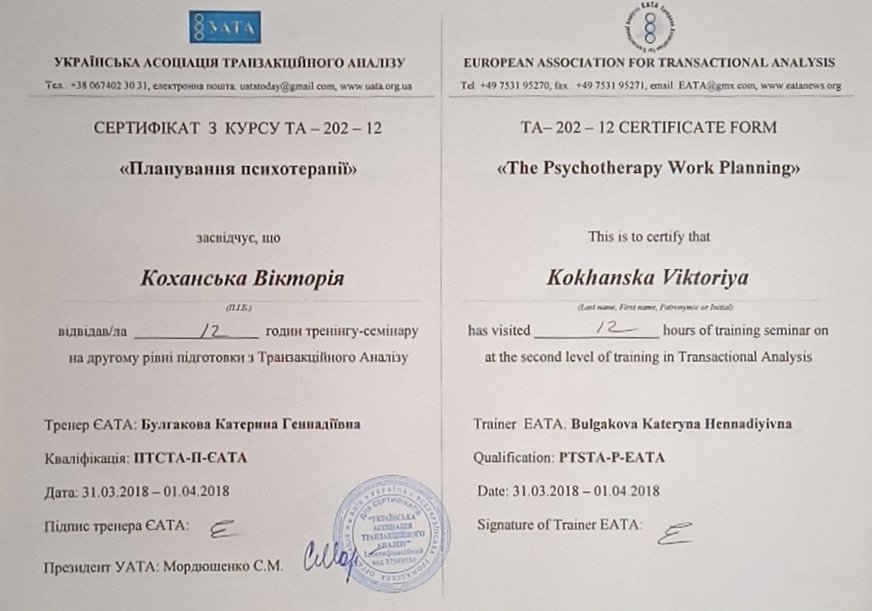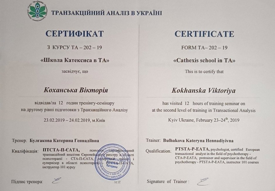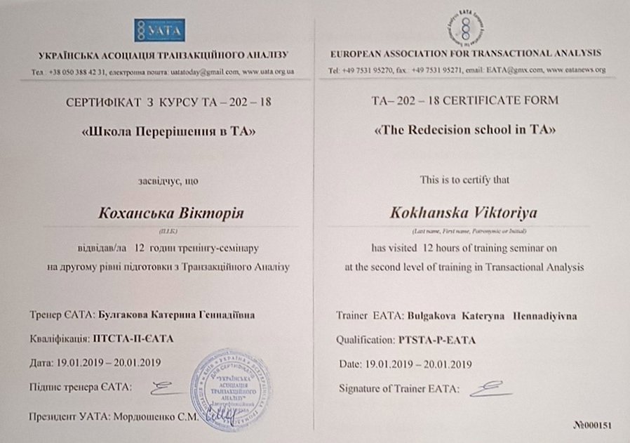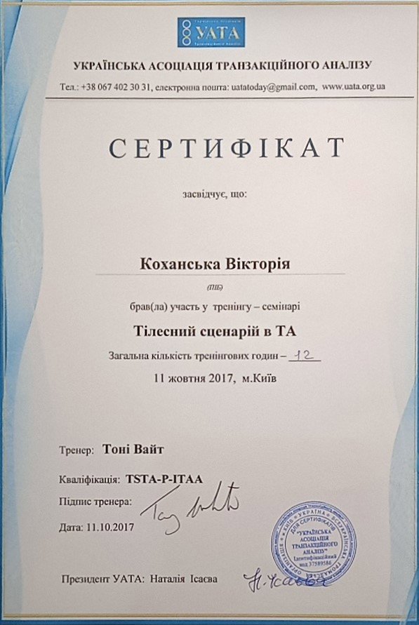 Украинская Ассоциация Транзакционного Анализа, в обучении (4г) подготовки в методе ТА по направлению Психотерапия.
