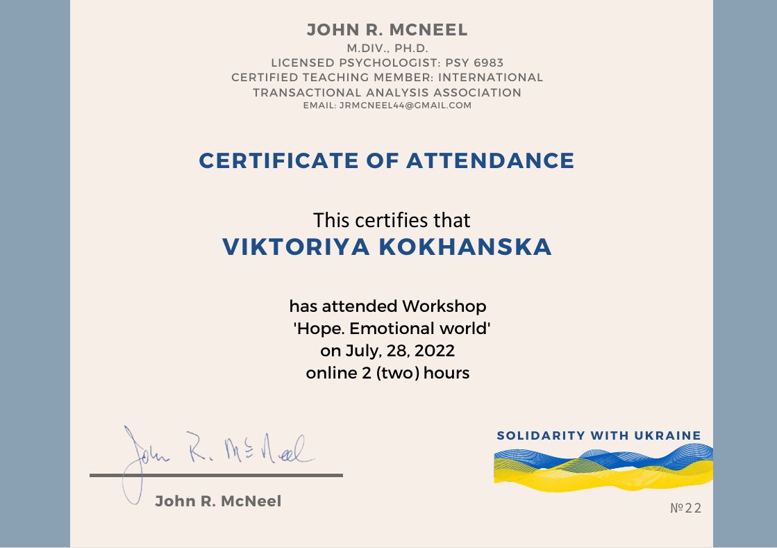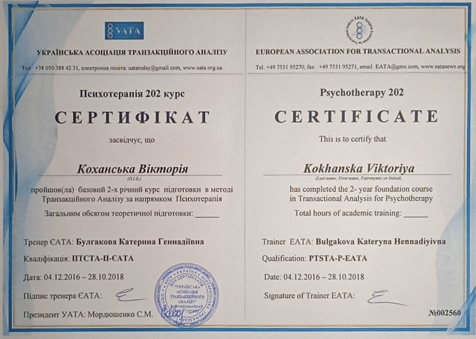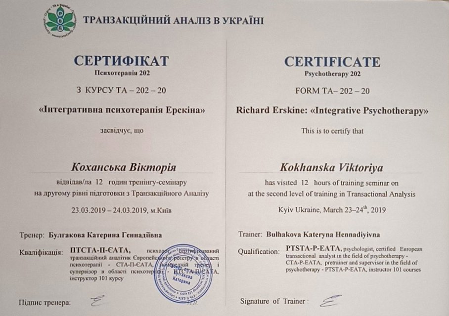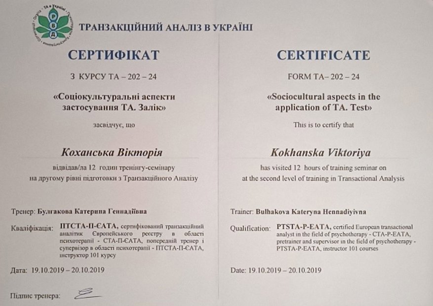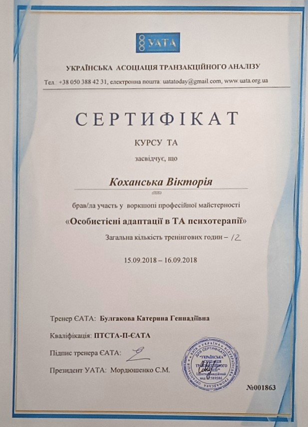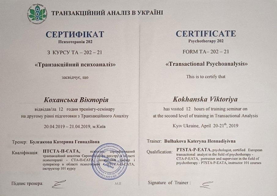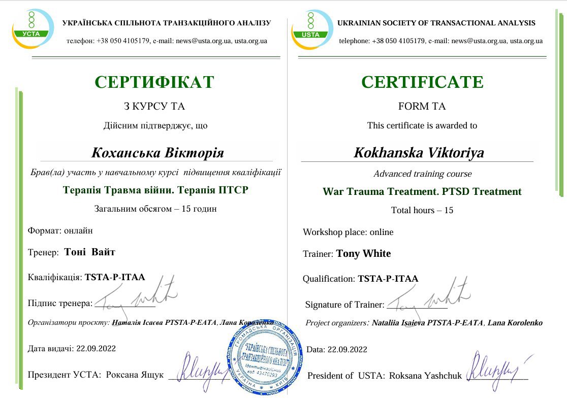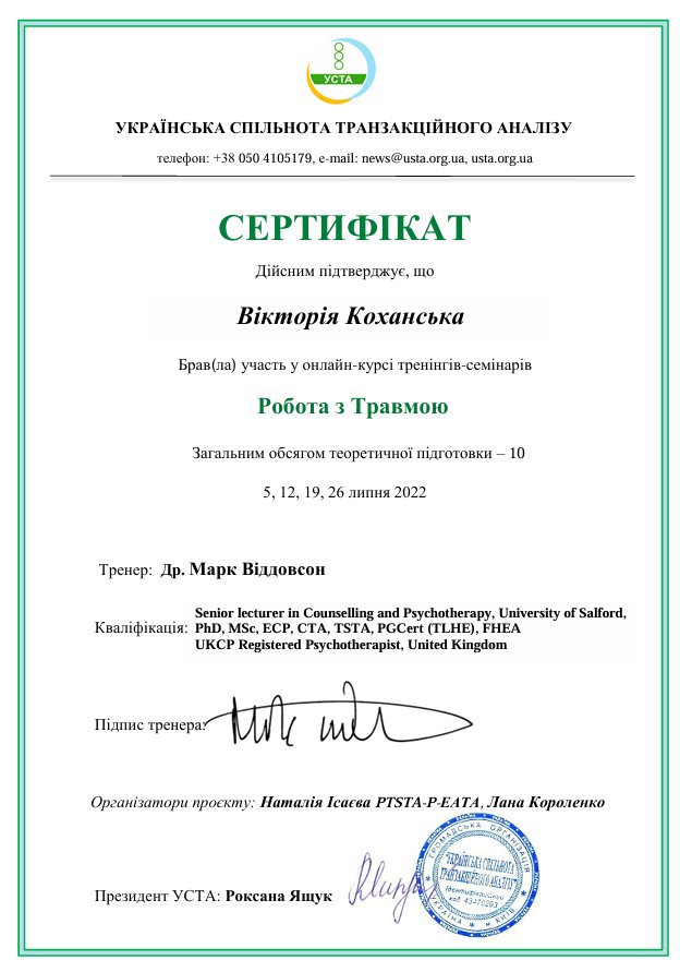 Украинская Ассоциация Транзакционного Анализа, в обучении (4г) подготовки в методе ТА по направлению Психотерапия.