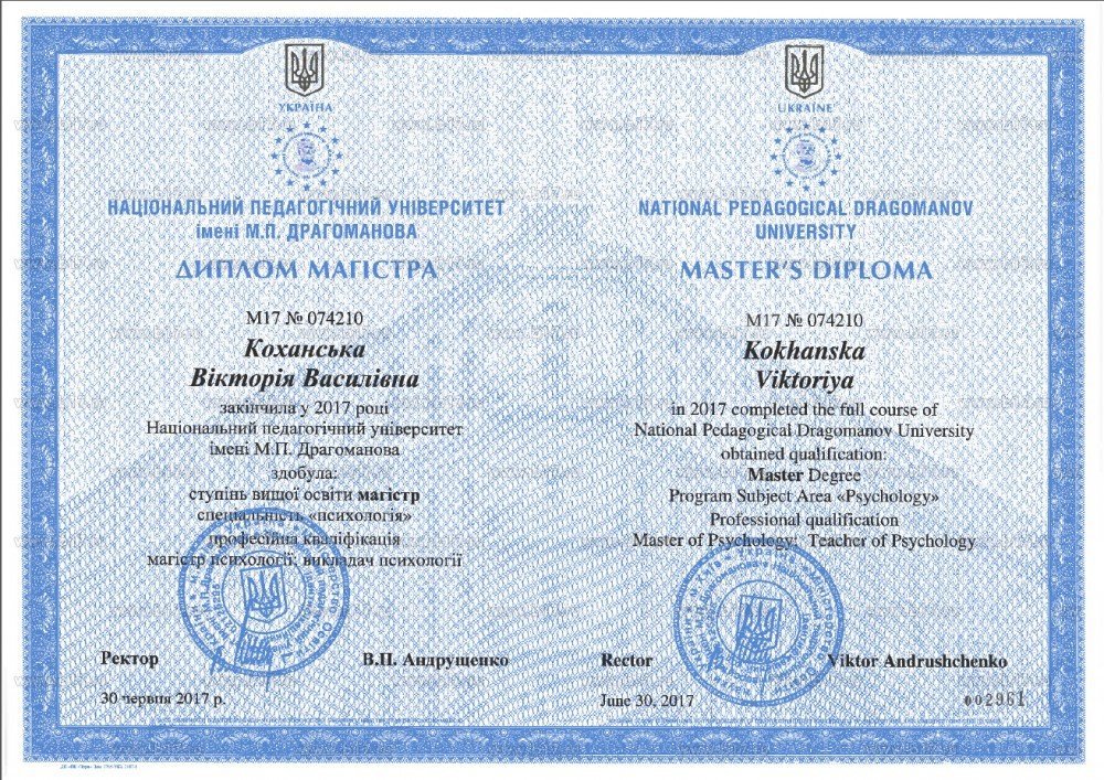Национальный педагогический университет имени М. П. Драгоманова, магистр психологии (2017).