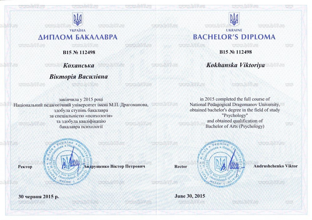 Национальный педагогический университет имени М. П. Драгоманова, бакалавр психологии (2015).