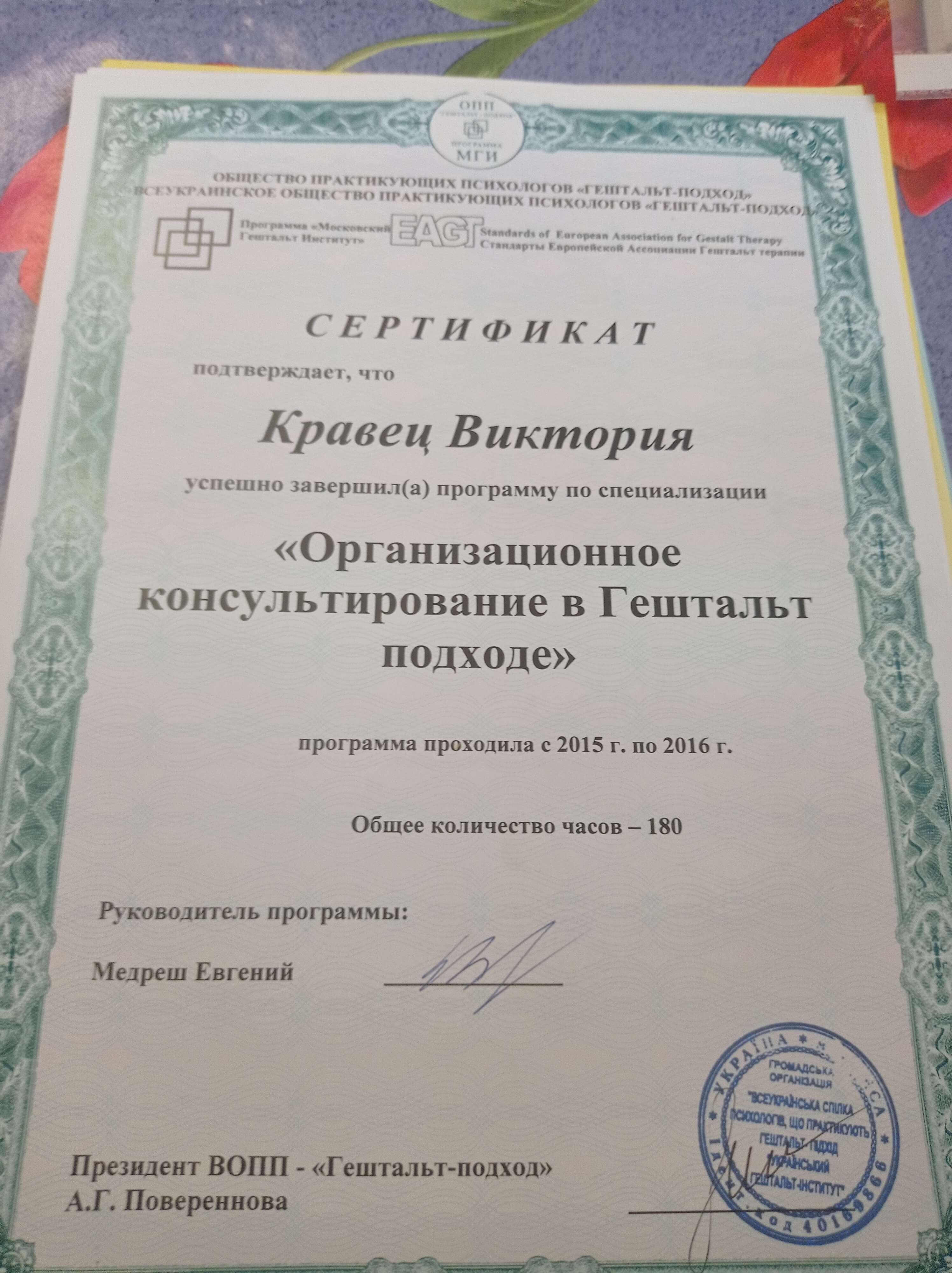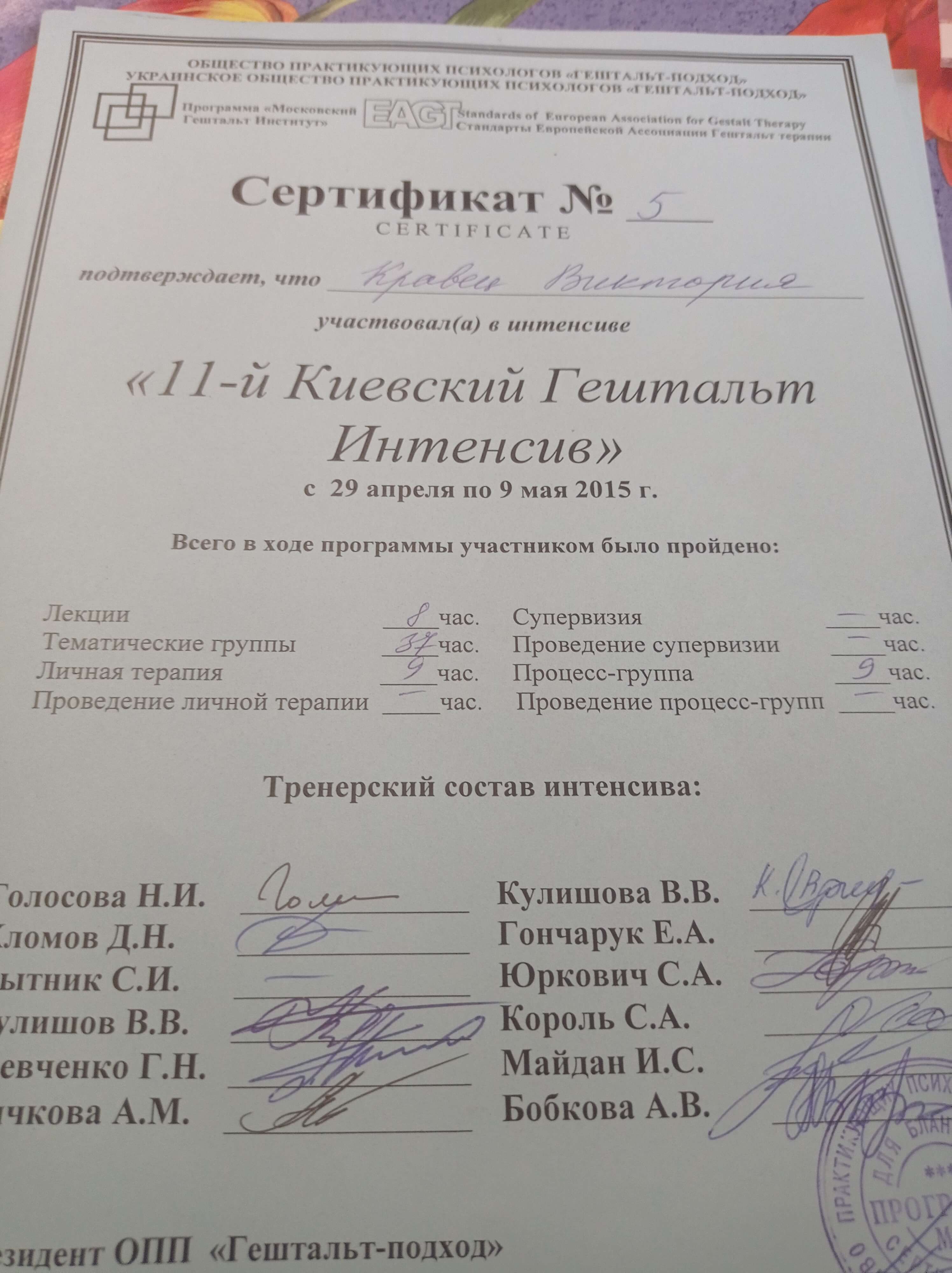 Законченное высшее психологическое образование , 1и 2 ступени московского Гештальт института, сейчас заканчиваю третью ступень (супервизор)