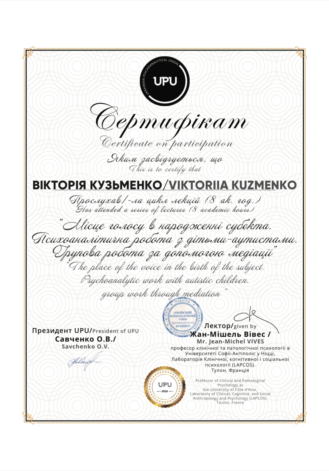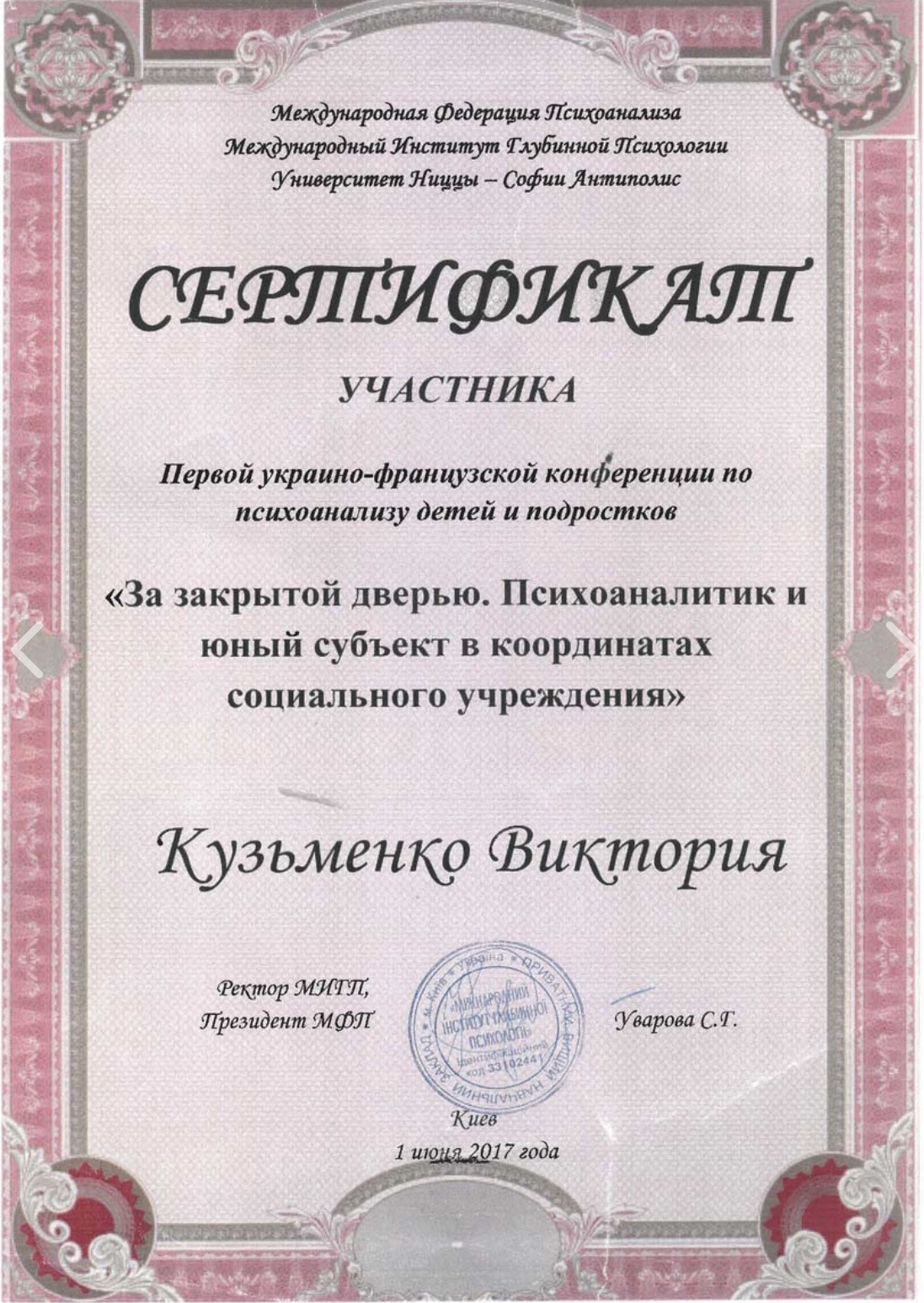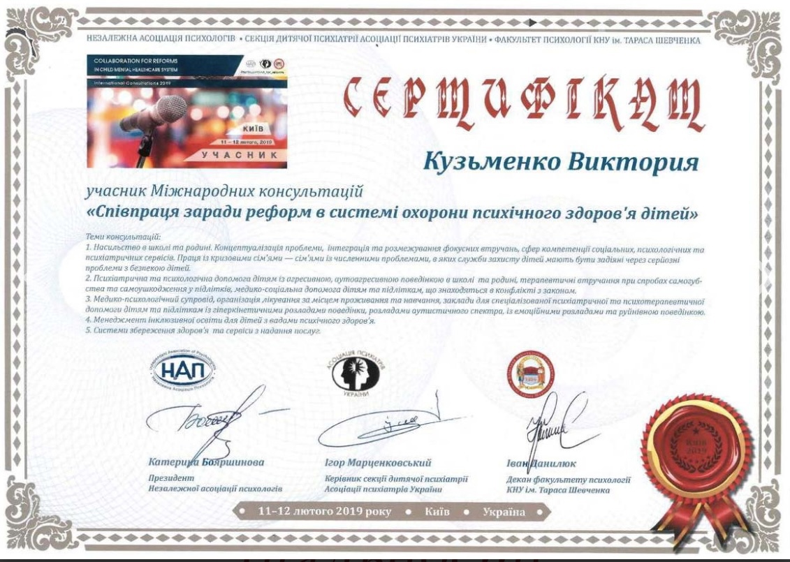 ✅ В 2017 году участник Первой Украино-французской конференции по психоанализу детей и подростков «За закрытыми дверями. Психоаналитик и юный субъект в координатах социального учреждения»;