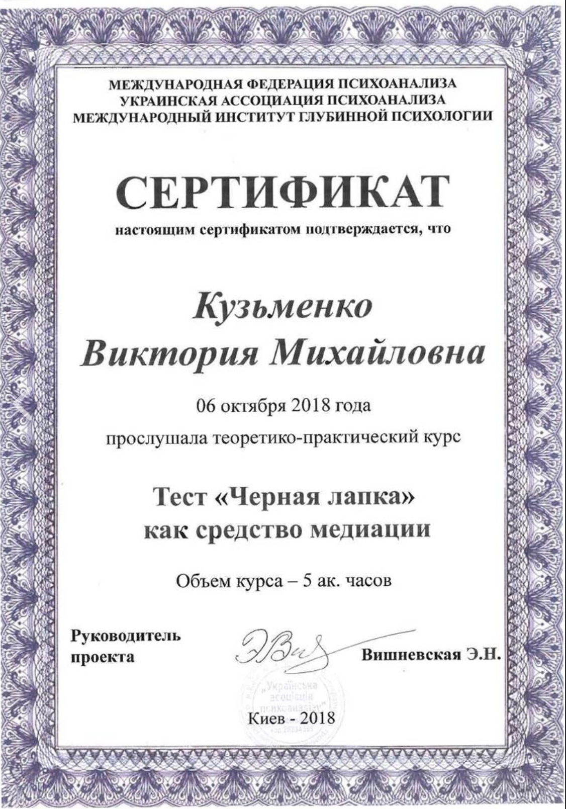 ✅ В 2018 году приняла участие в учебном проекте: «От психоаналитической теории к практике»;