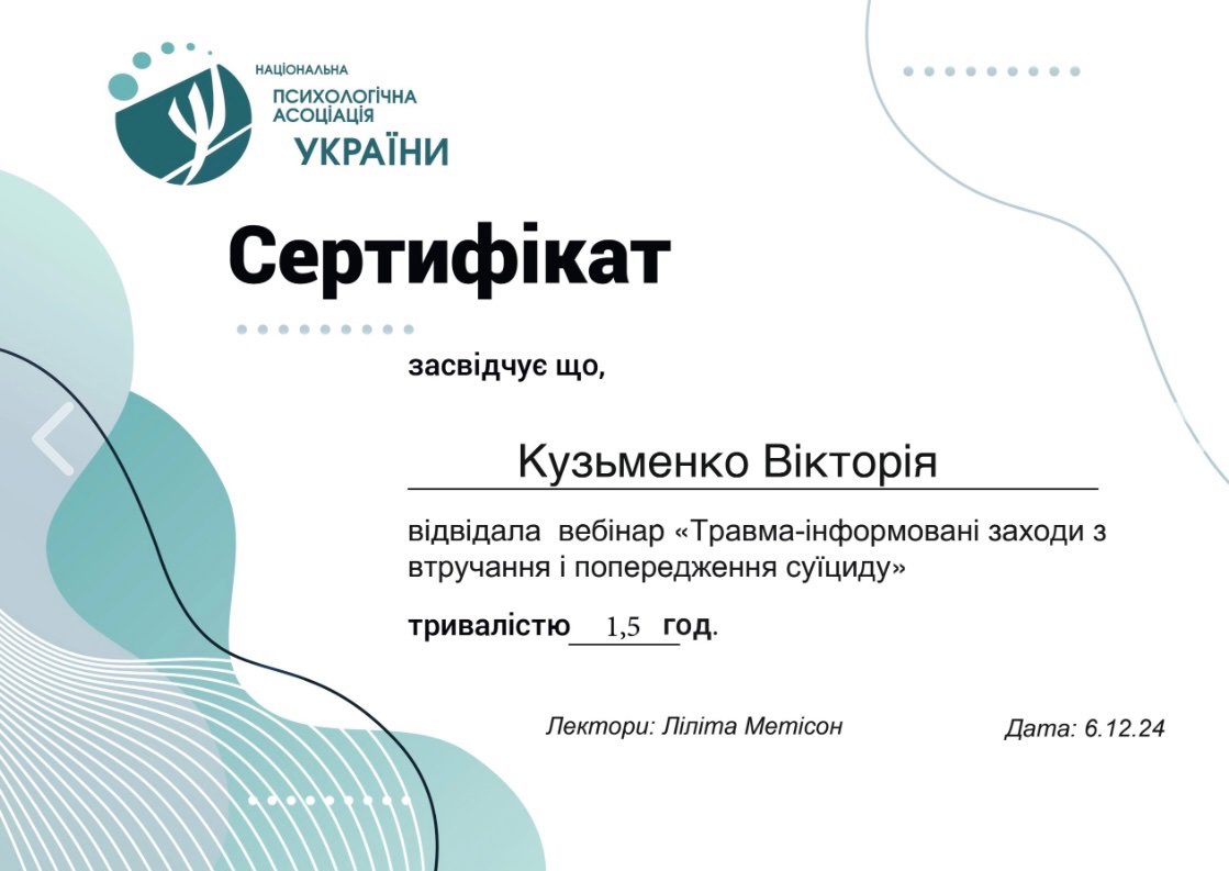 ✅ В 2024 году посетила вебинар «Травма-информированные мероприятия по вмешательству и предупреждению суицида»;