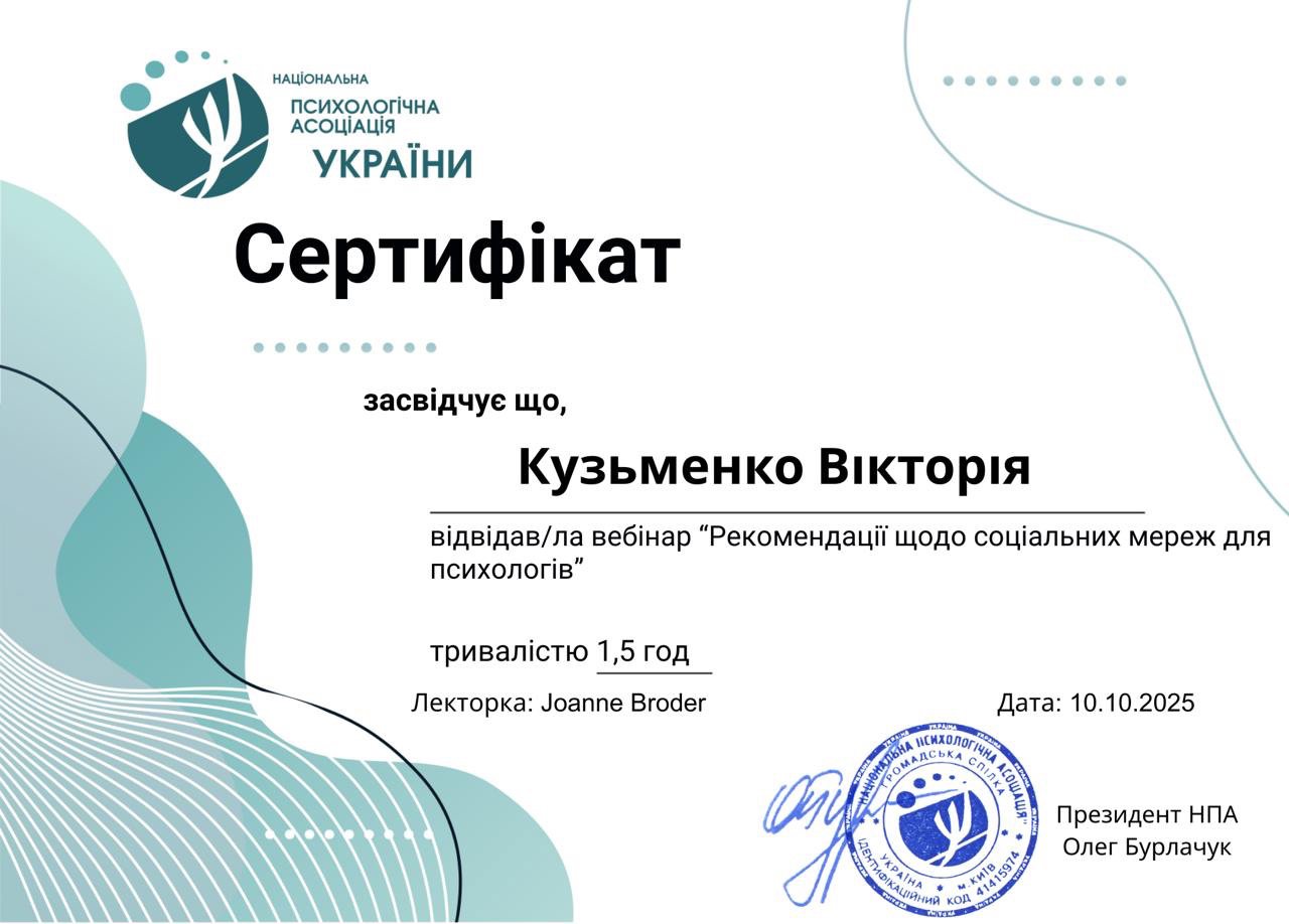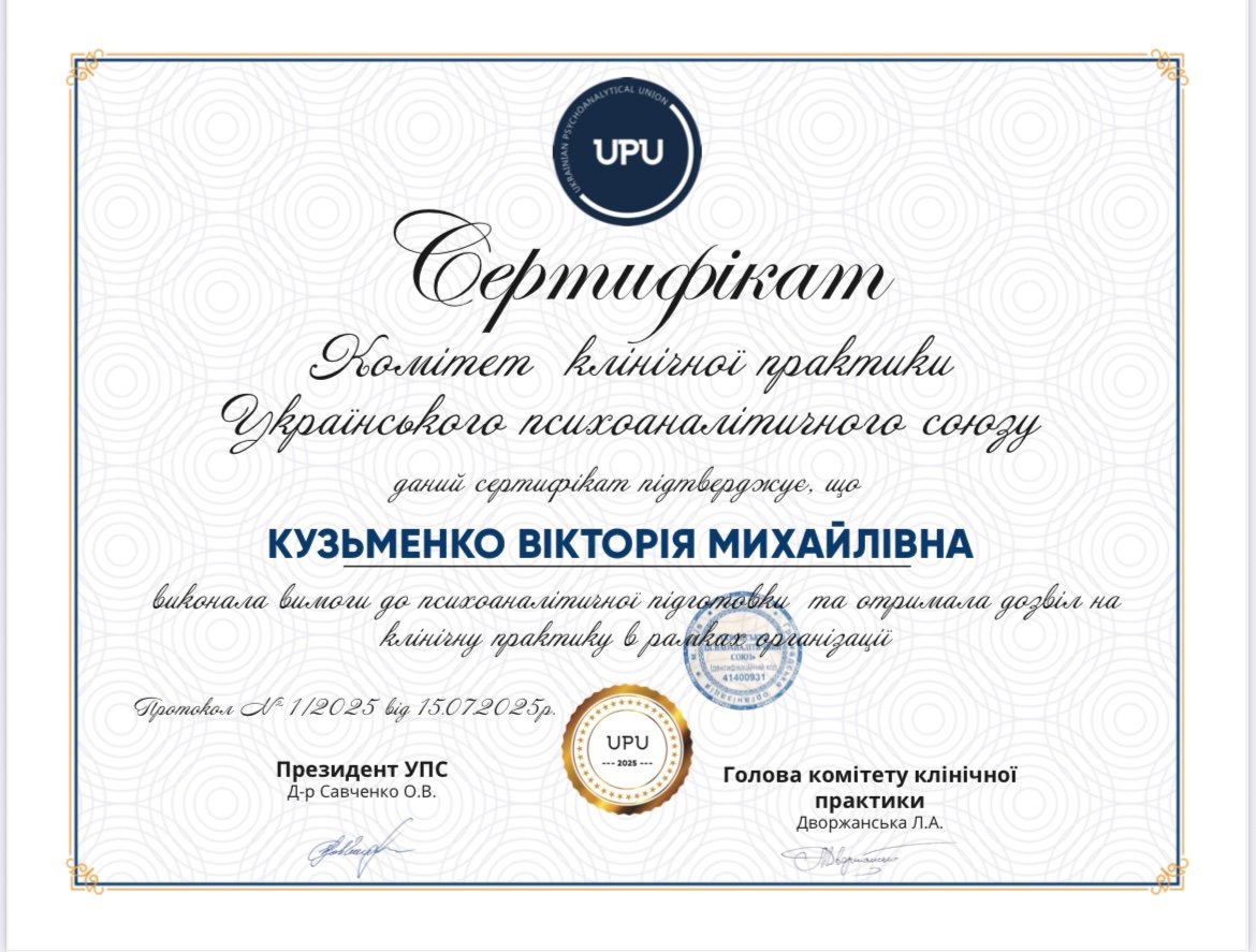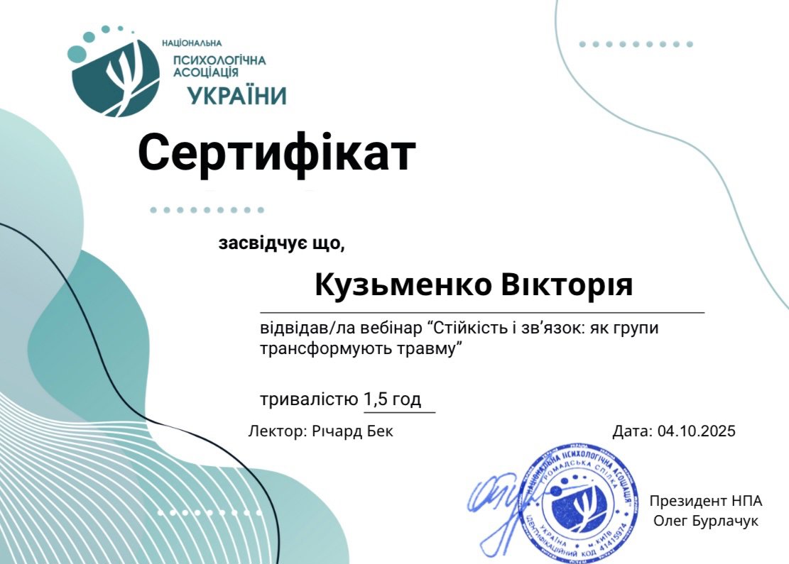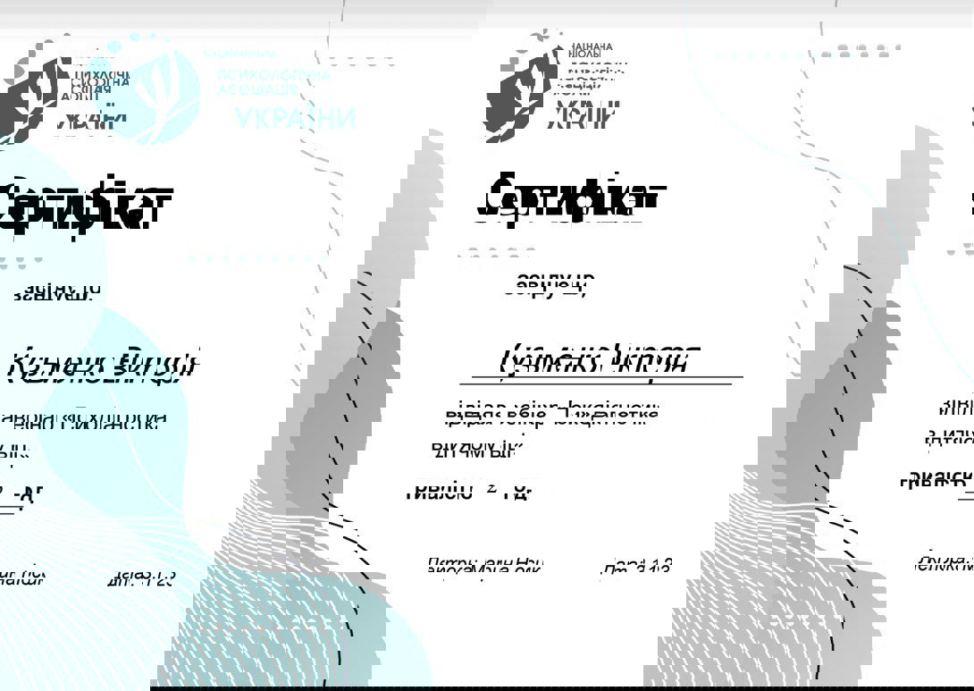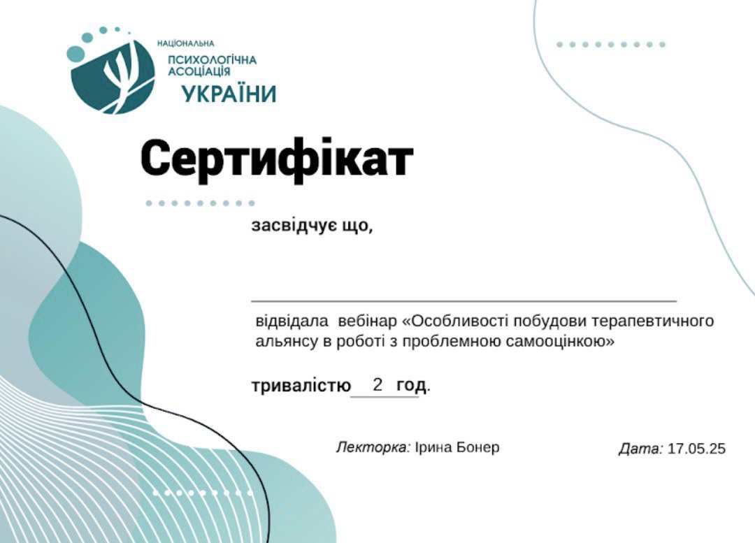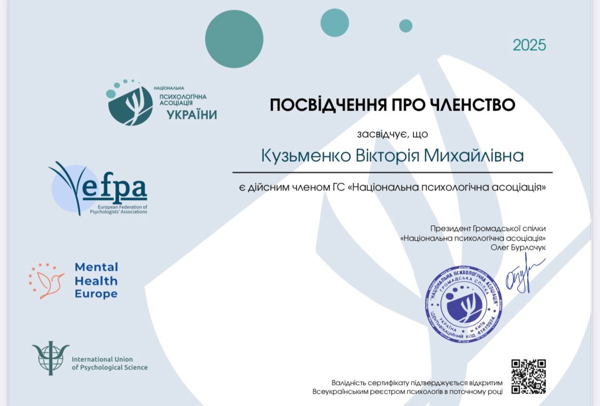 психоаналитической терапии детей и подростков, Член Дивизиона "Психоаналитическая психология и психотерапия" НПА, Член Украинского Психоаналитического Союза, Член Ассоциации Психологов Украины, Член Украинской ассоциации организационных психологов и психологов труда.