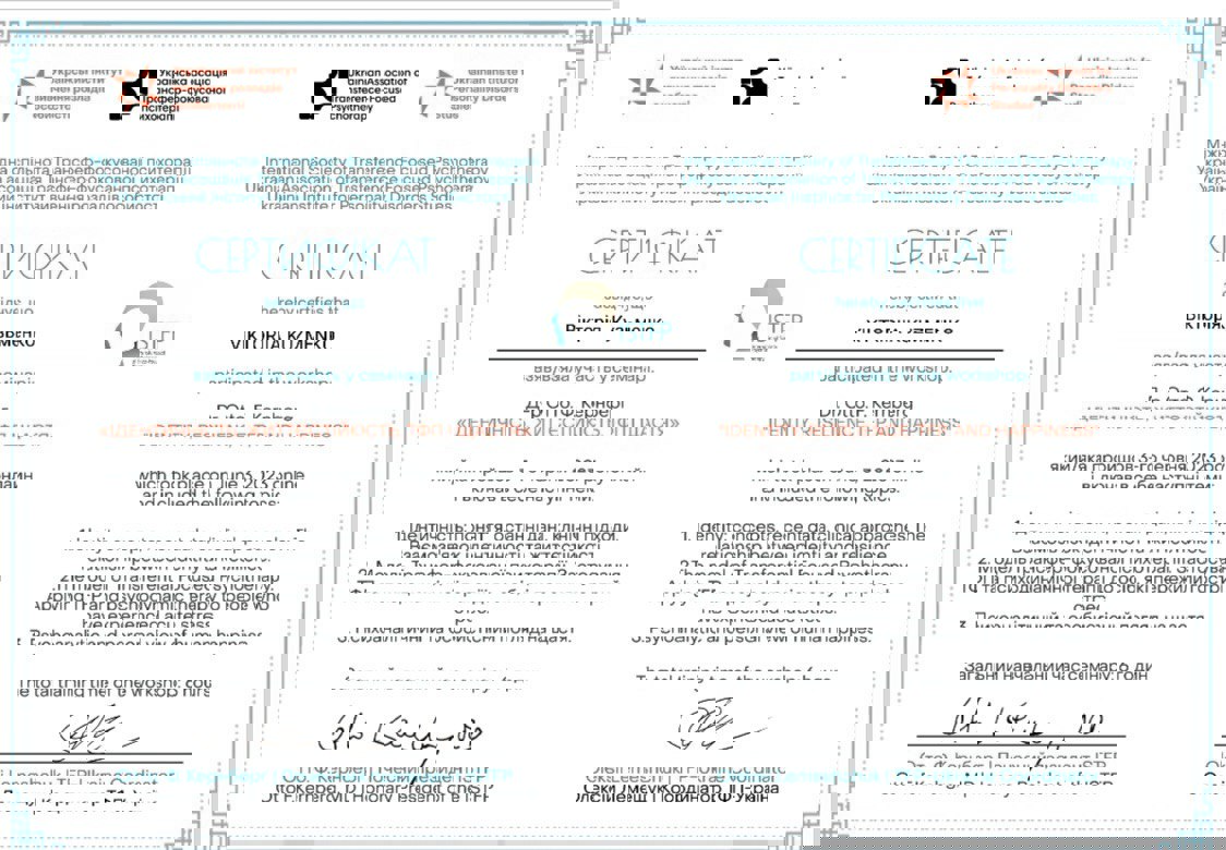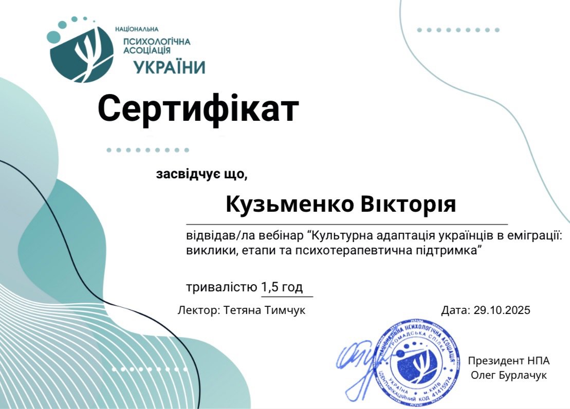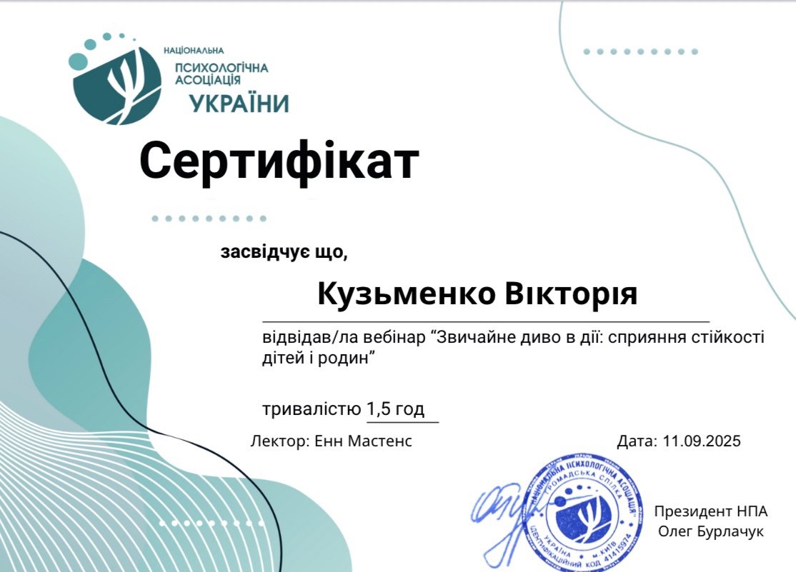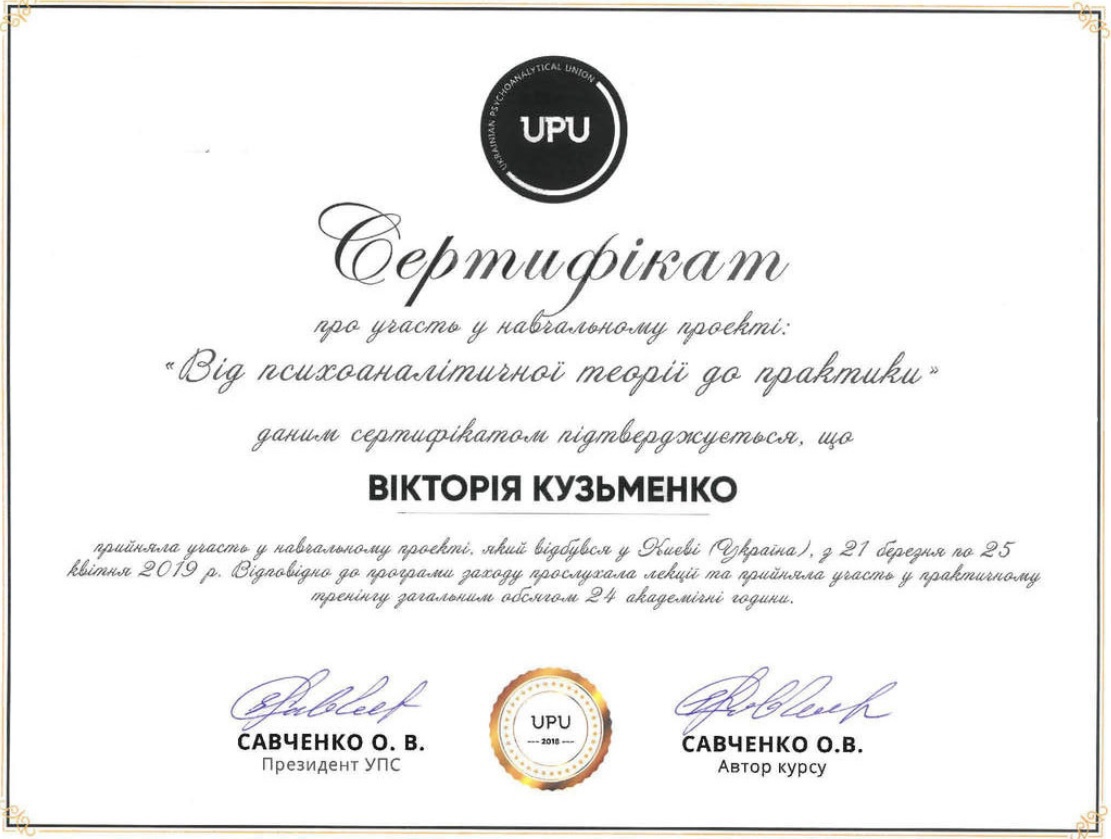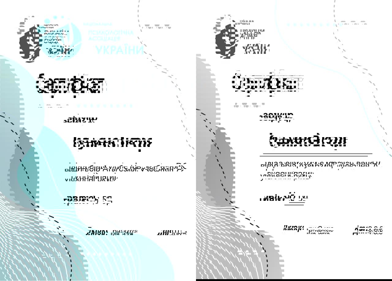 психоаналитической терапии детей и подростков, Член Дивизиона "Психоаналитическая психология и психотерапия" НПА, Член Украинского Психоаналитического Союза, Член Ассоциации Психологов Украины, Член Украинской ассоциации организационных психологов и психологов труда.