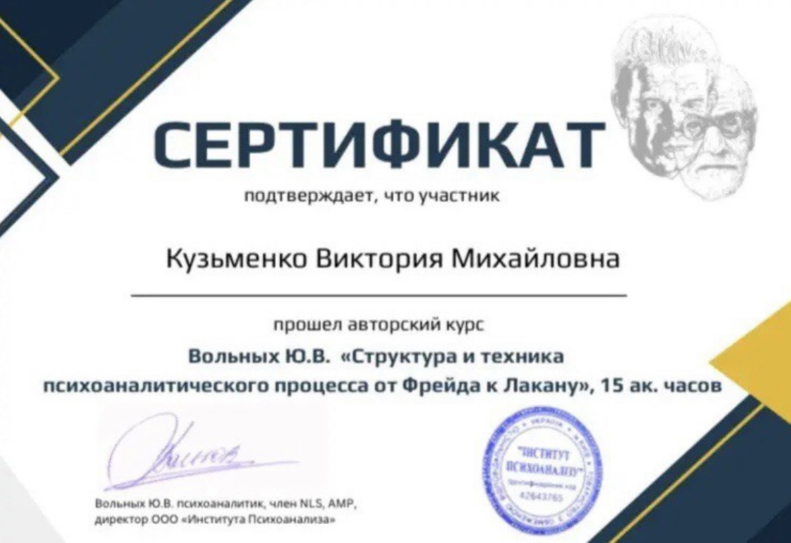 ✅ В 2023 году окончила Центр психоанализа Градивая специализация по клиническому психоанализу «Психоаналитическая работа с неневротическими пациентами»;