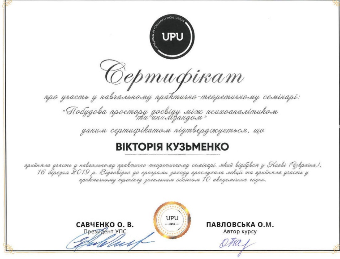 ✅ В 2018 году приняла участие в учебном практически-теоретическом семинаре: «Построение пространства опыта между психоаналитиком и анализандом»;