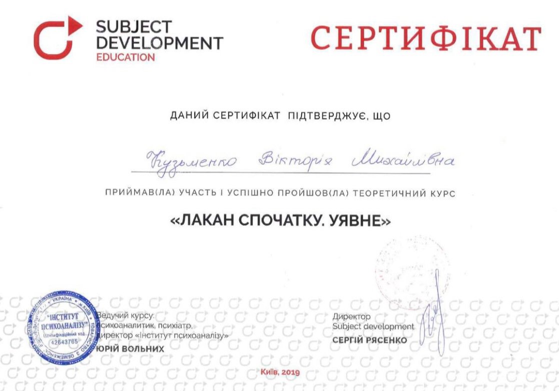 ✅ В 2019 году приняла участие и успешно прошла теоретический курс «Лакан сначала. Воображаемое»;