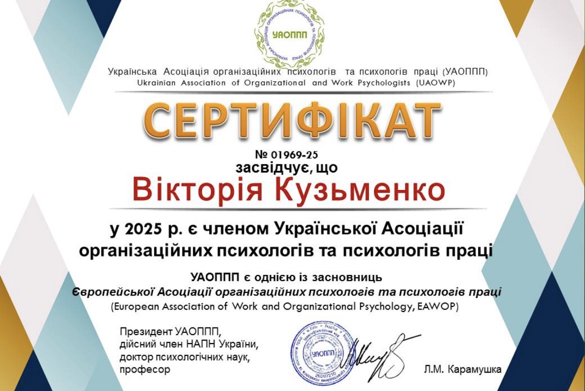 ✅ В 2025 году является членом Украинской Ассоциации организационных психологов и психологов труда»;