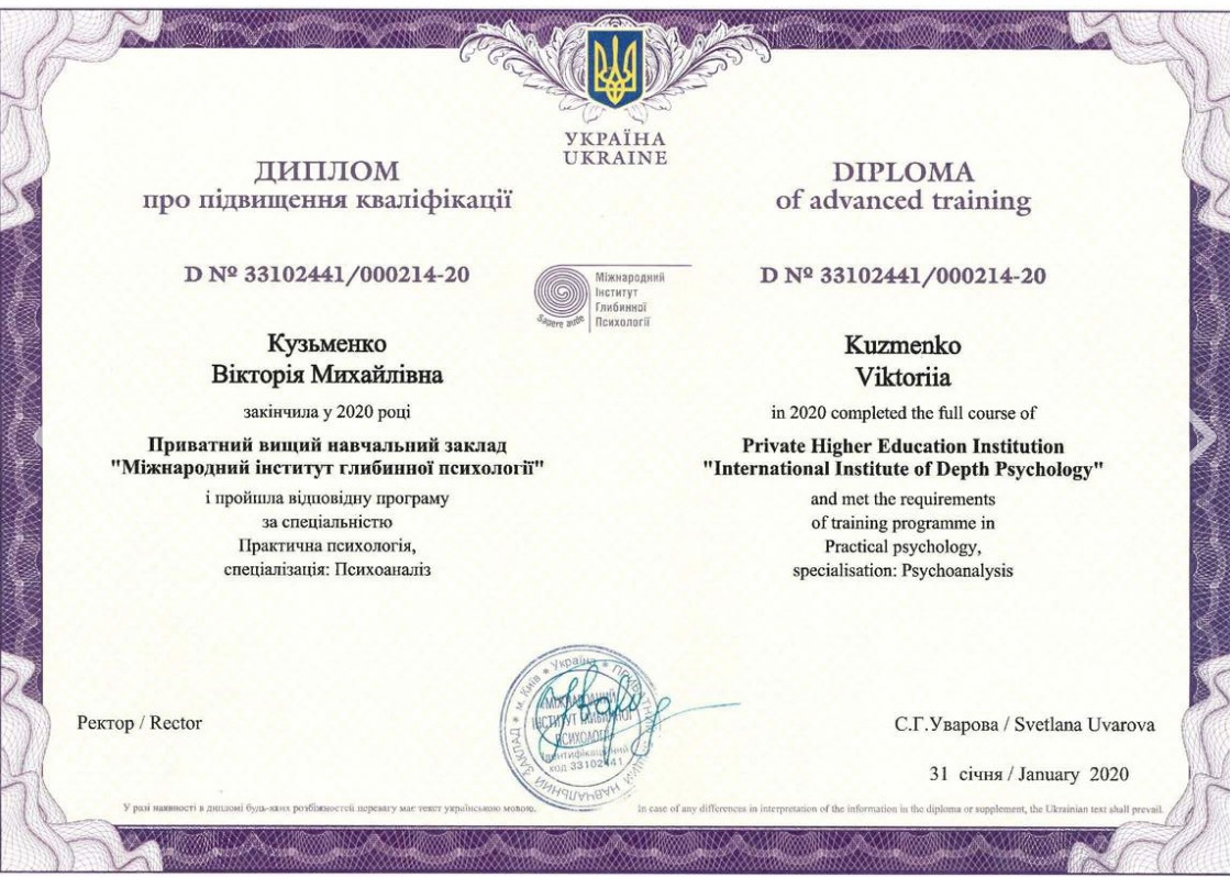 Частное высшее учебное заведение «Междуодный институт глубинной психологии». С 29 сентября 2017 года по 27 мая 2018 года прошла специализацию по клиническому психоанализу «Психоаналитическая терапия детей и подростков», объемом 176 часов.