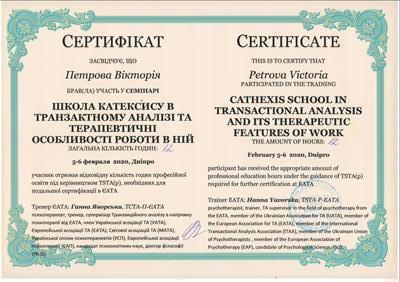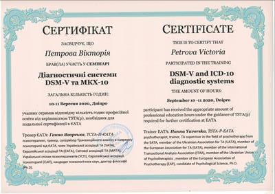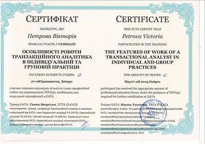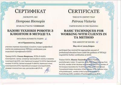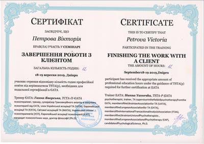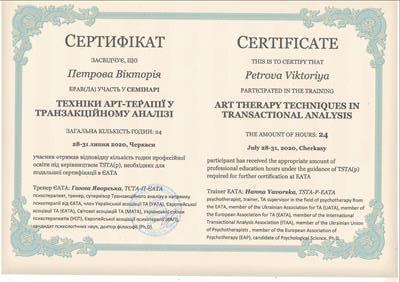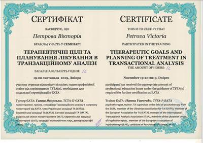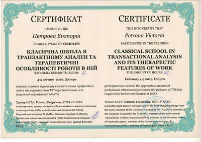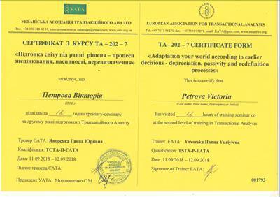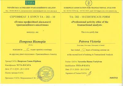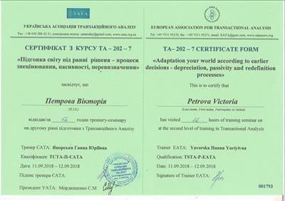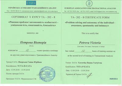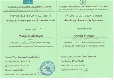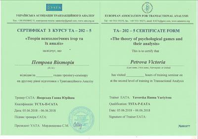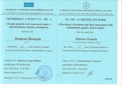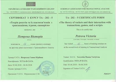 А. Нобеля - специальность « Психология». Кандидат на статус сертифицированного транзактного аналитика европейского реестра в области психотерапии (СТА-п- ЕАТА)