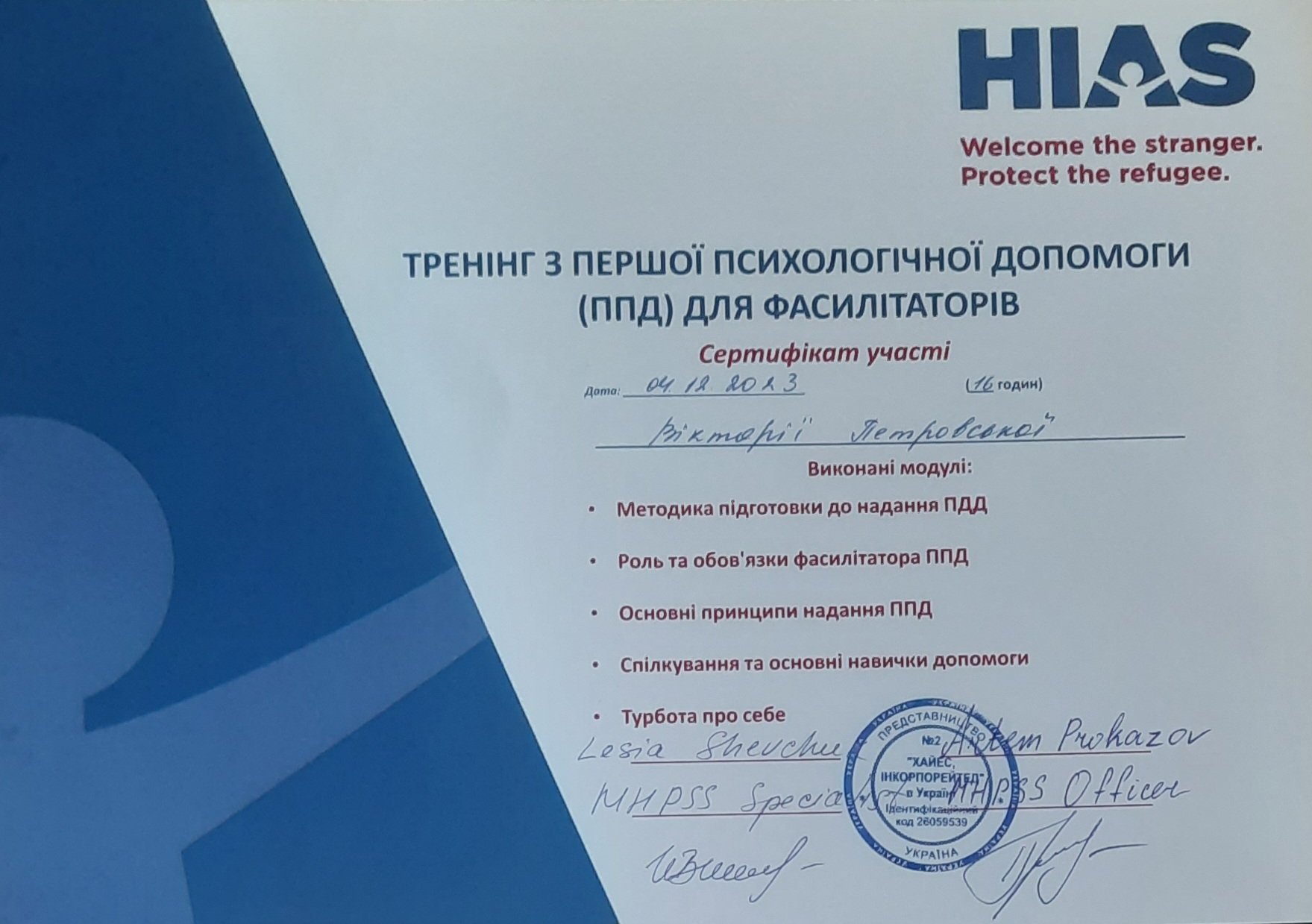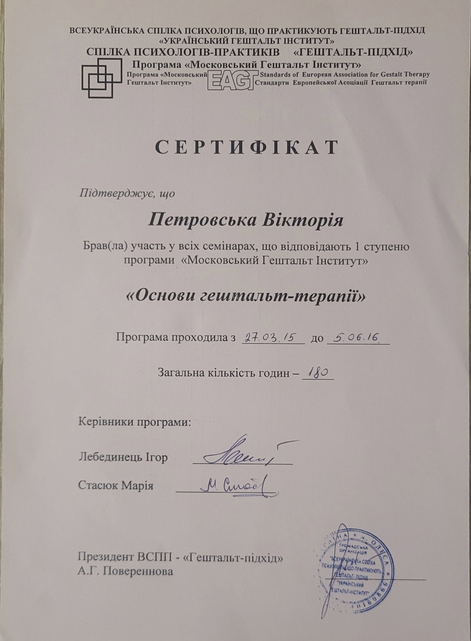 Национальная ассоциация гештальт-терапевтов Украины (НАГТУ) – I, II степень.