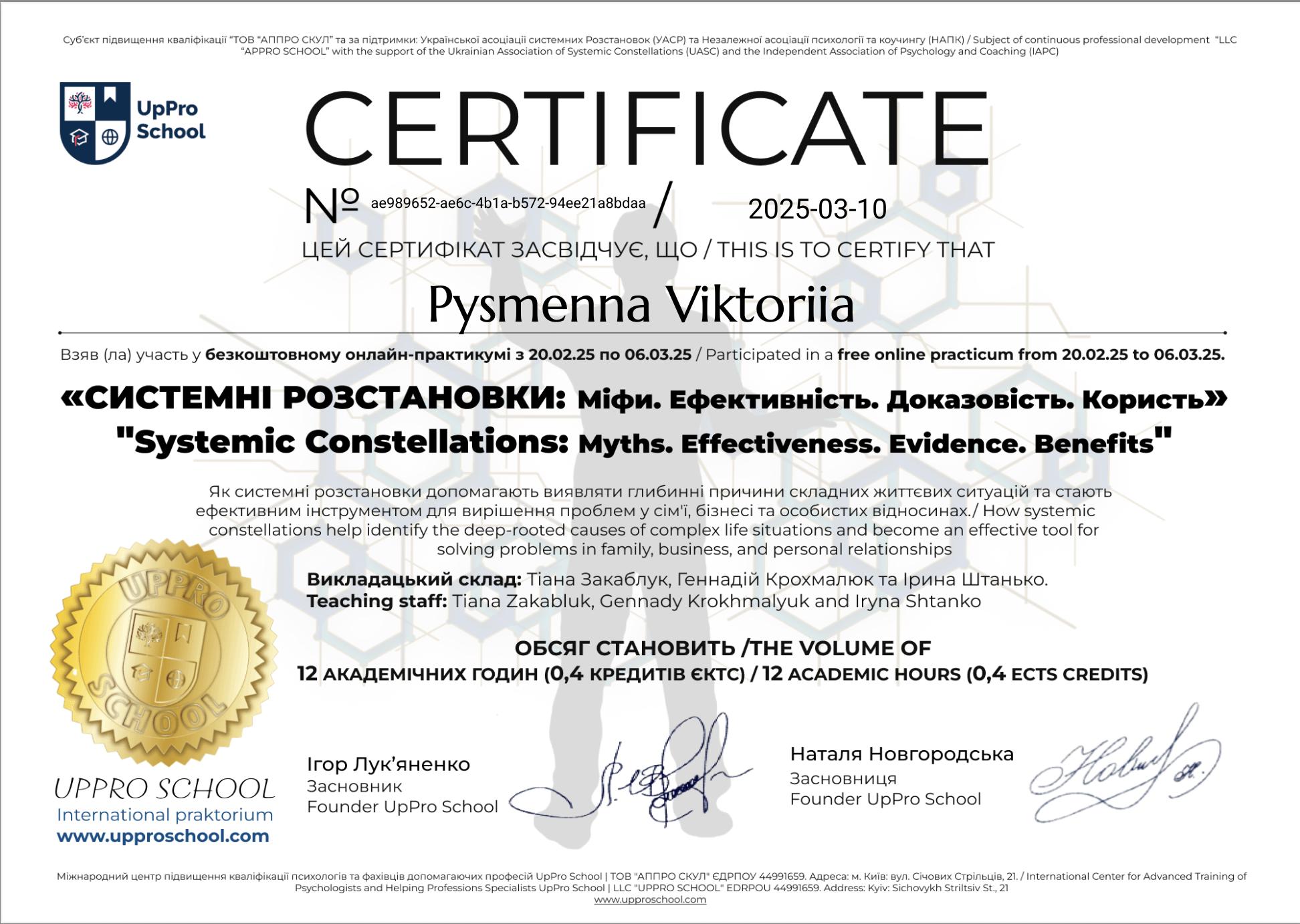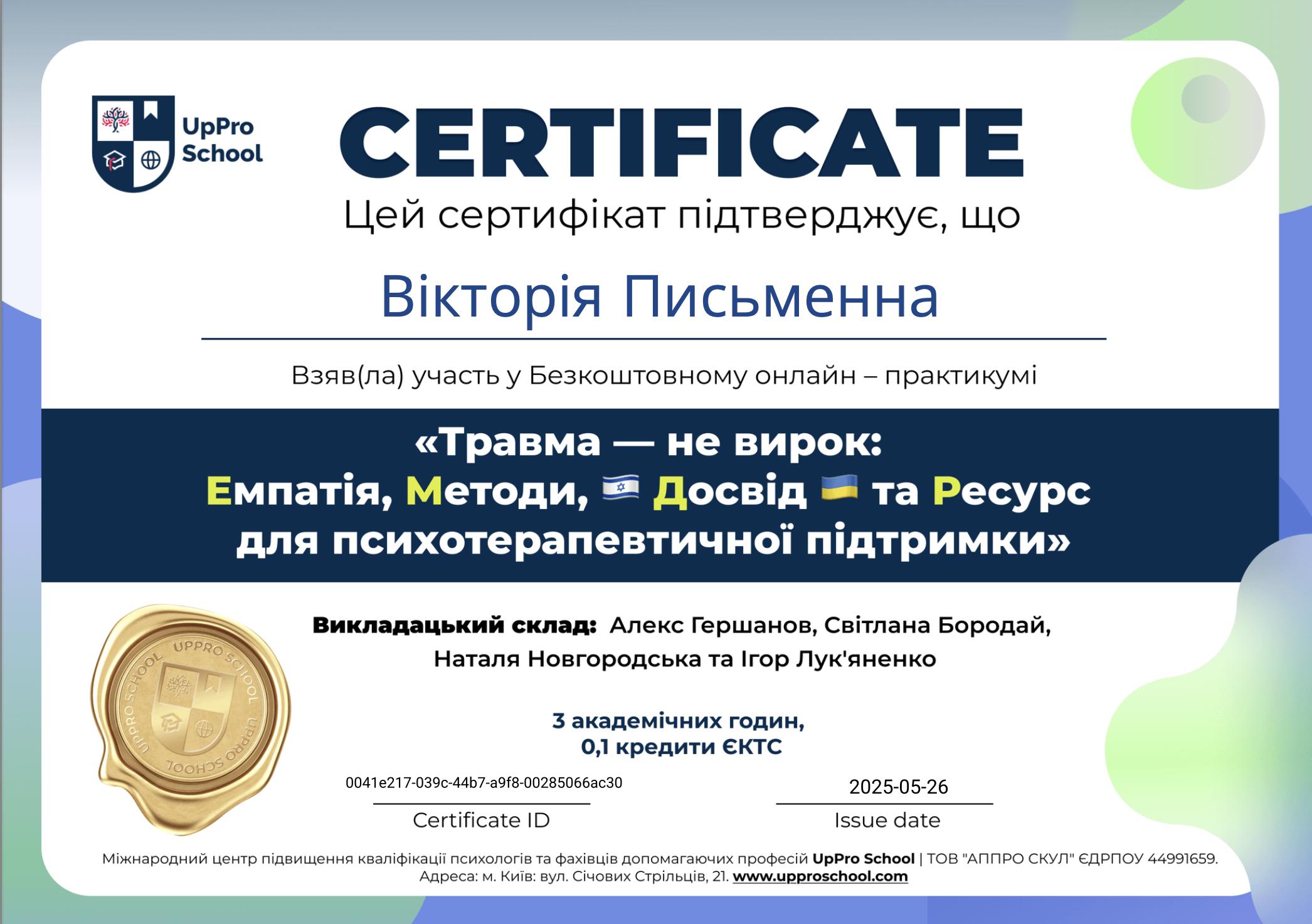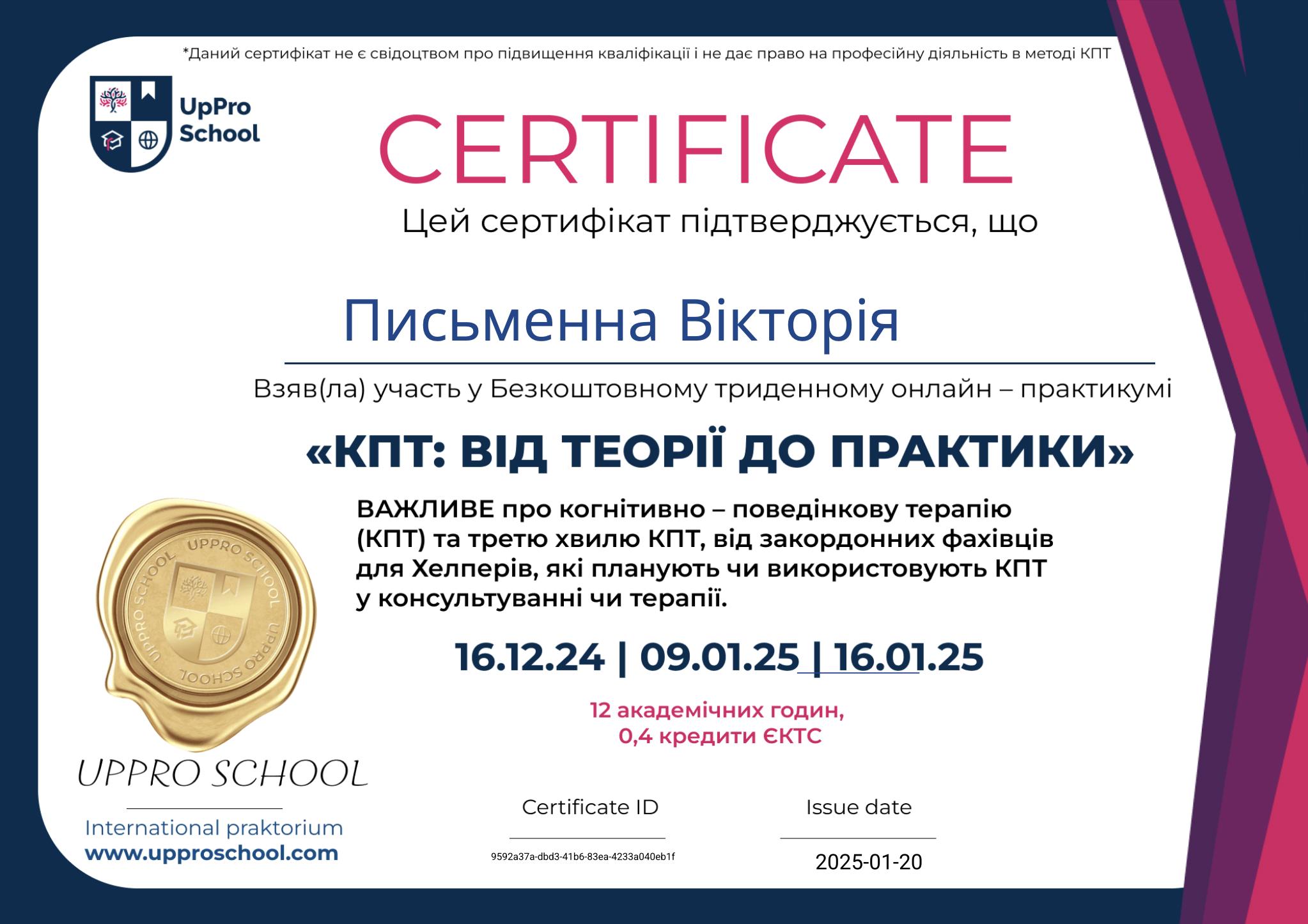 1) Украинский институт когнитивно-поведенческой терапии, программа КПТ+ (в обучении)