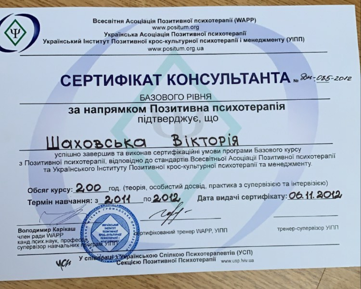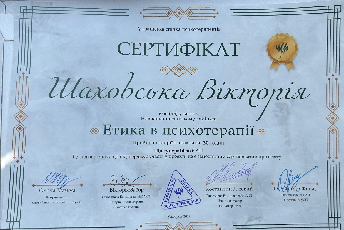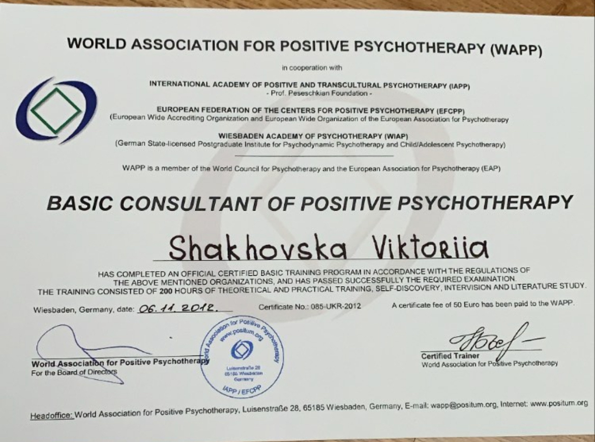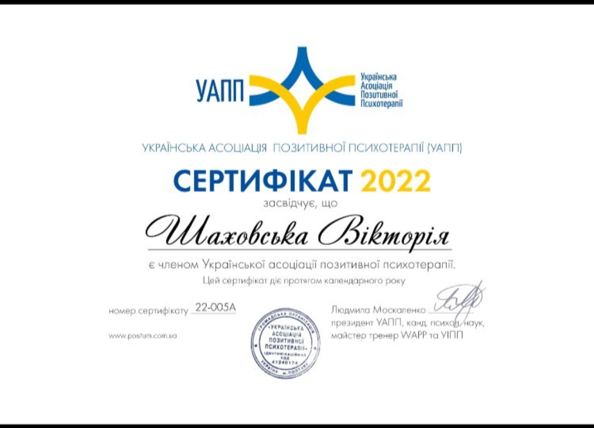 2022г. Украинская ассоциация положительной психотерапии. Сертификат члена УАПП. №22-005А