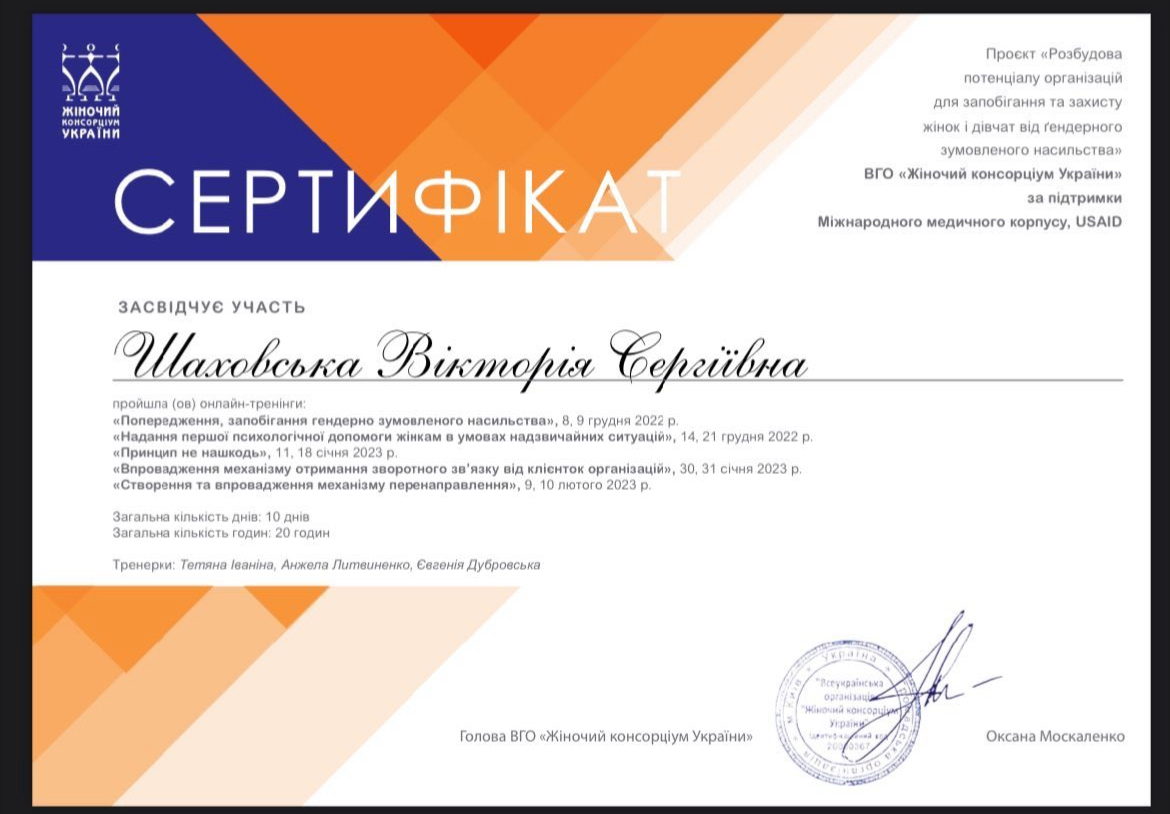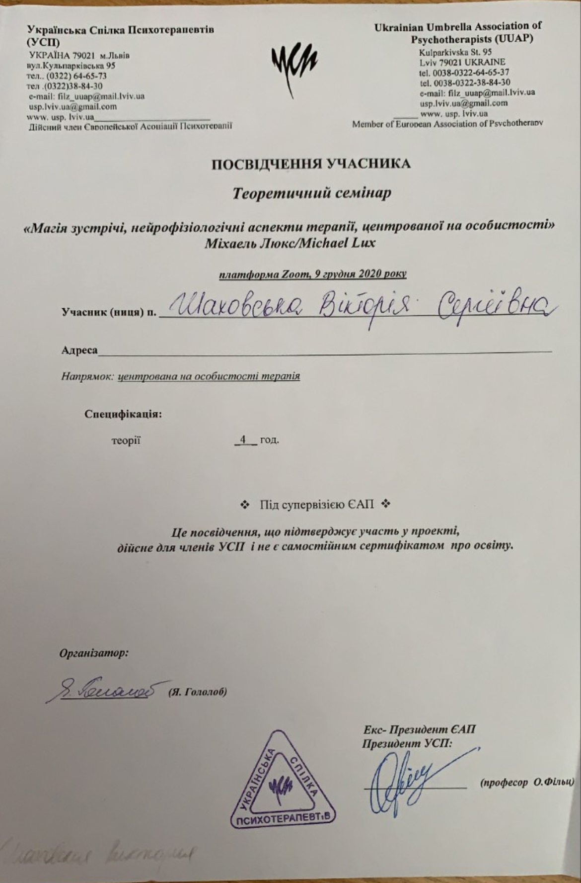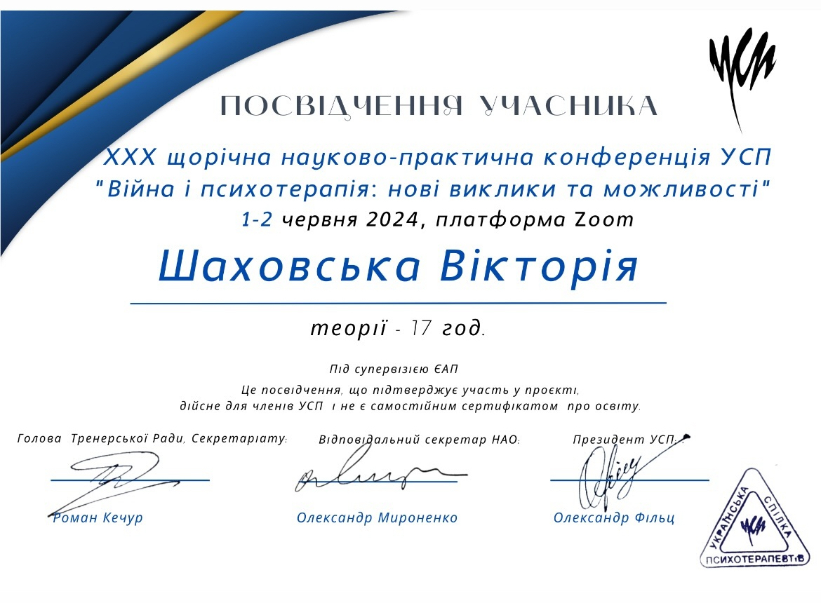 2022г. Украинская ассоциация положительной психотерапии. Сертификат члена УАПП. №22-005А