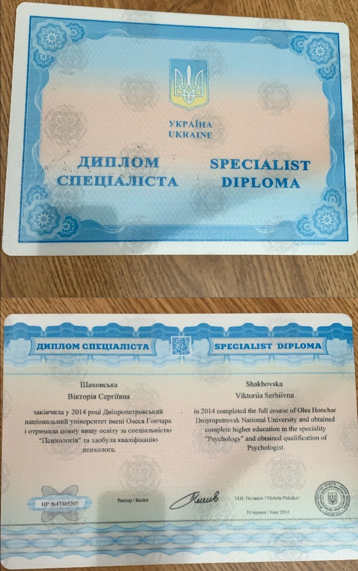 Высшее учебное заведение Днепропетровский национальный университет им. О. Гончара, высшее образование по специальности «Психология» квалификация психолог. Диплом HP N°47305207 от 30.06.2014