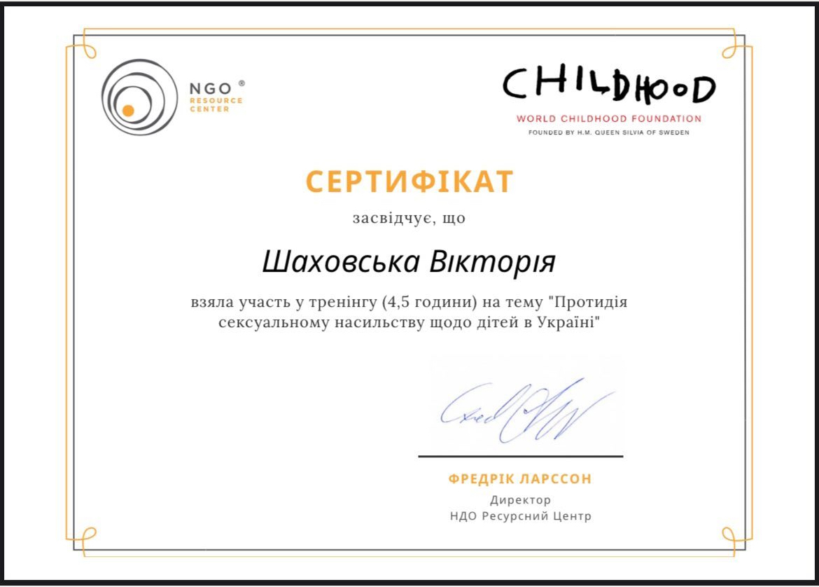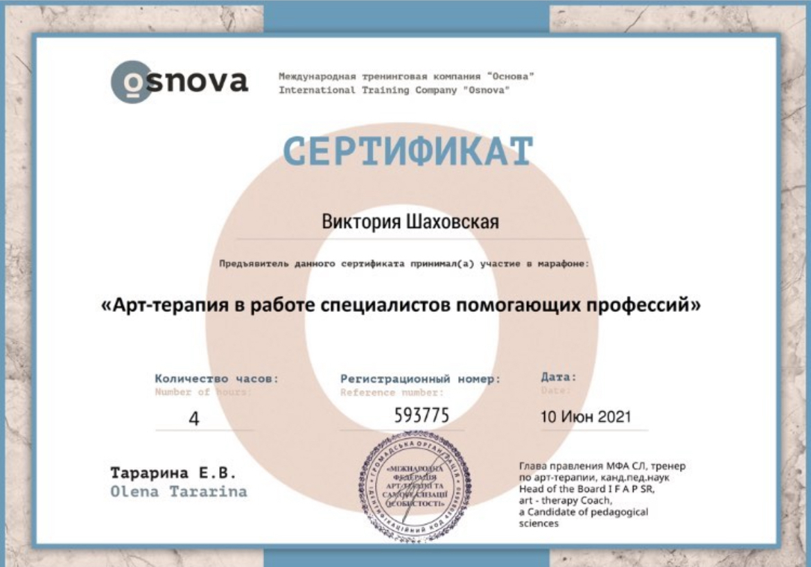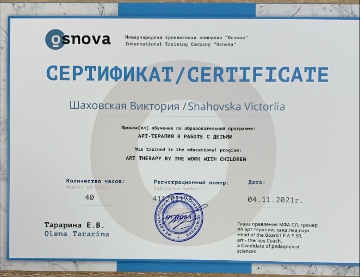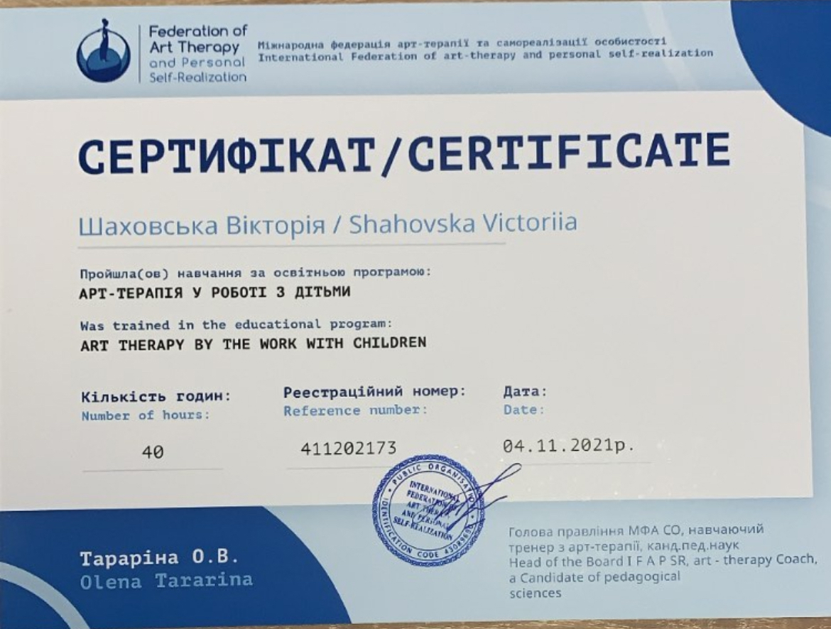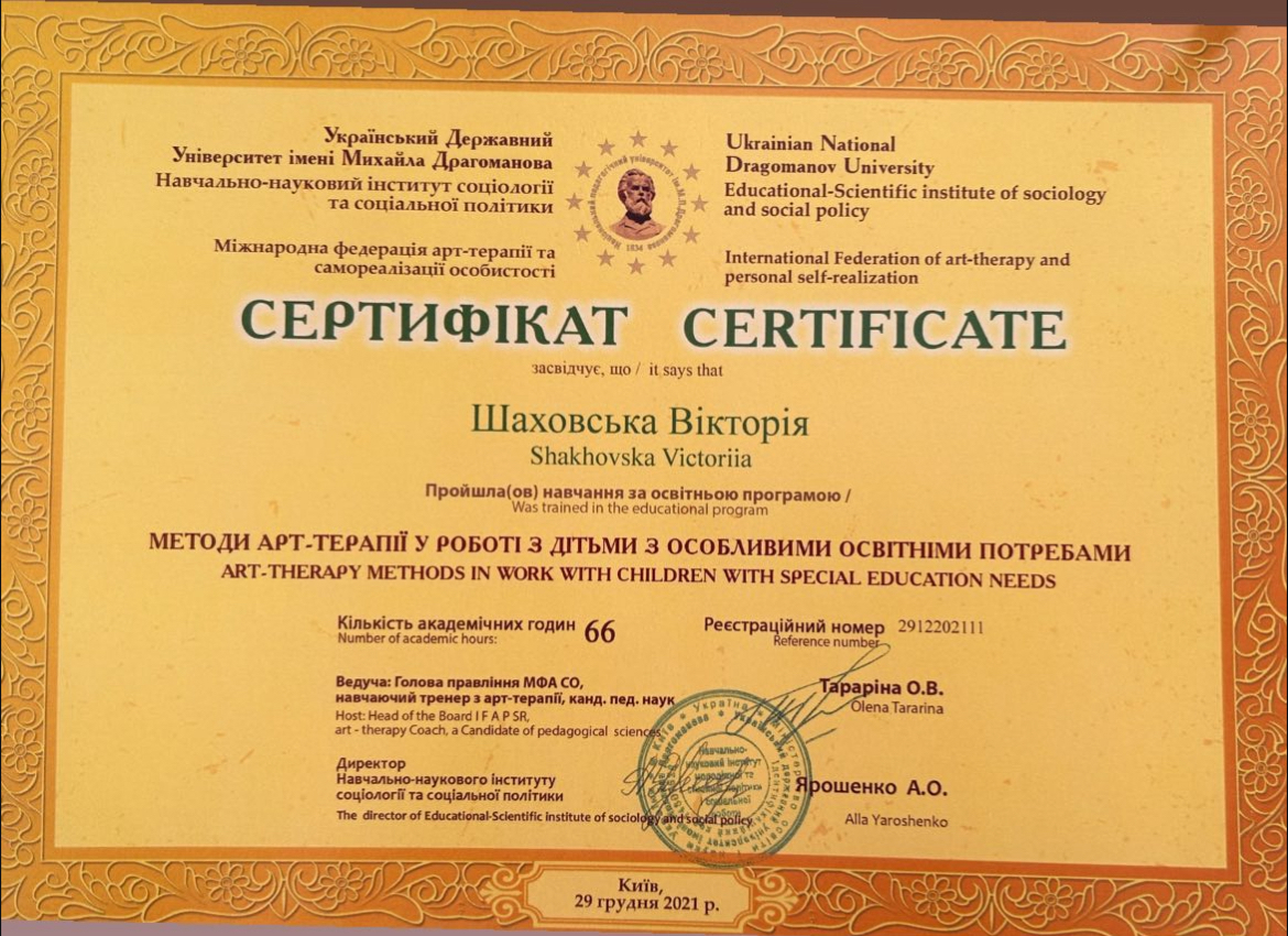 2021г. – Национальный педагогический университет им. Драгоманова. Арт-терапия в работе с особыми детьми 40 ак.