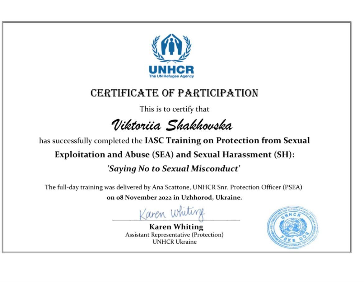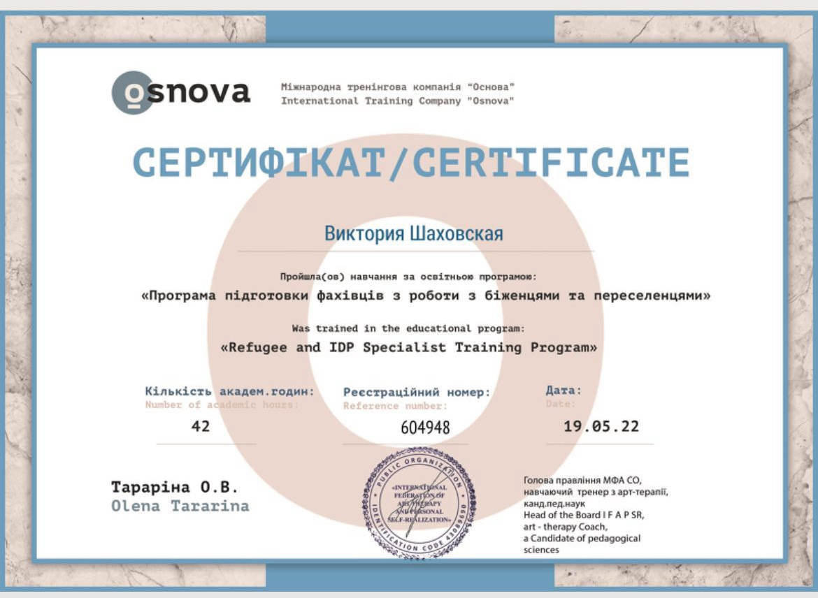 2022г. – Международная тренинговая компания «Основа». Программа подготовки специалистов по работе с беженцами и переселенцами. 42 ок.год
