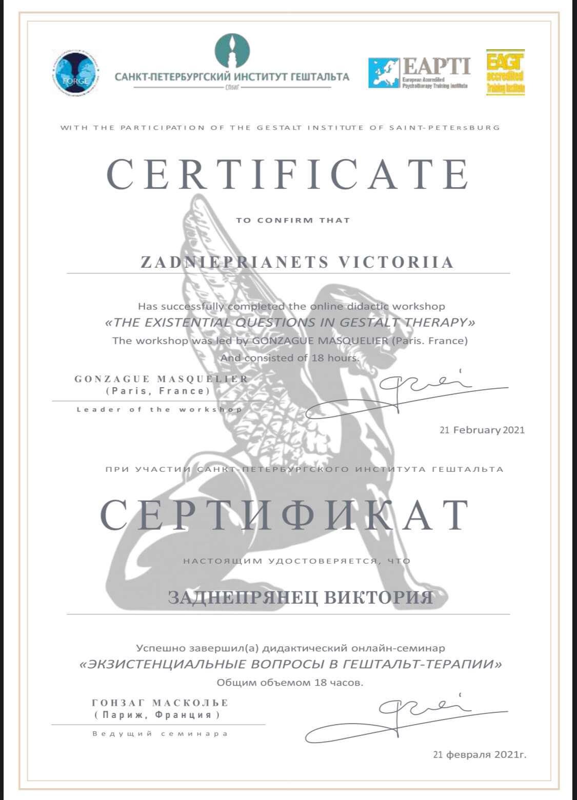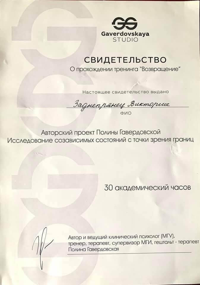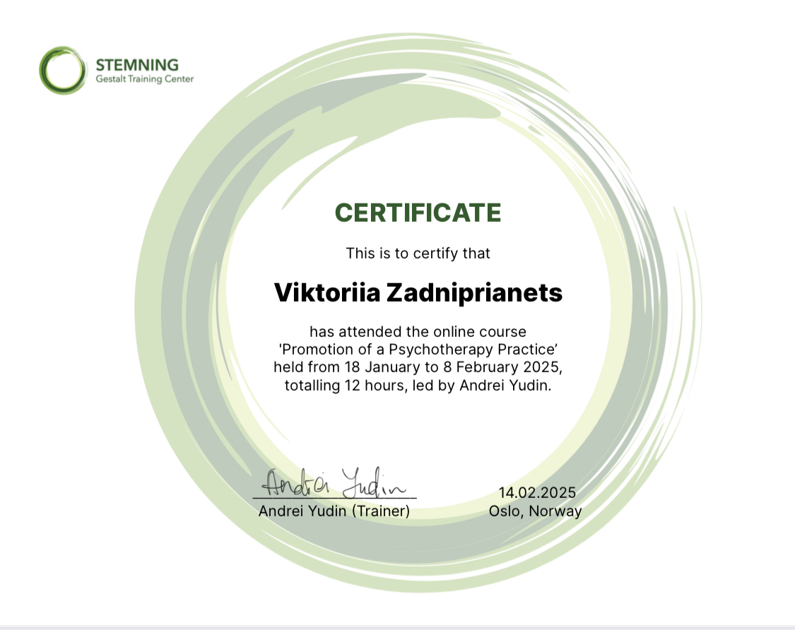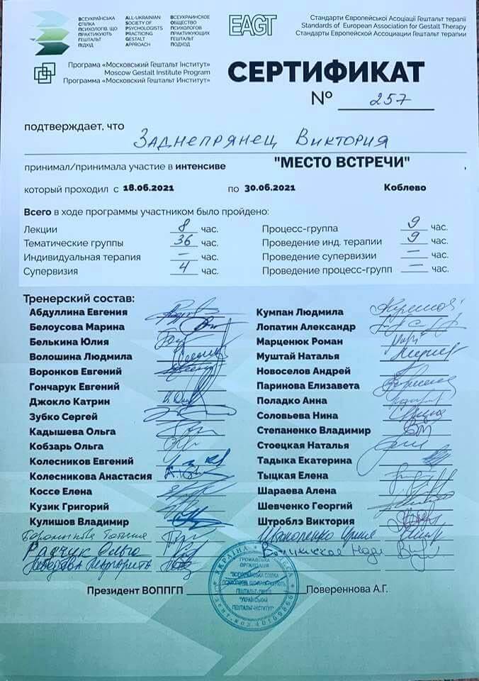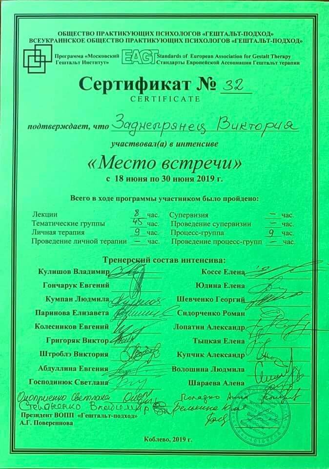 27 лет личной и групповой терапии. Теперь Живу Свою Жизнь, которая стала более качественной. Психотерапия помогла мне реализовывать мои мечты. Теперь я знаю, как помочь моим клиентам в темах, которые я уже проработала в собственной психотерапии.
